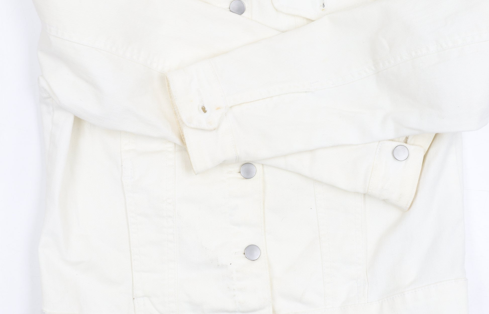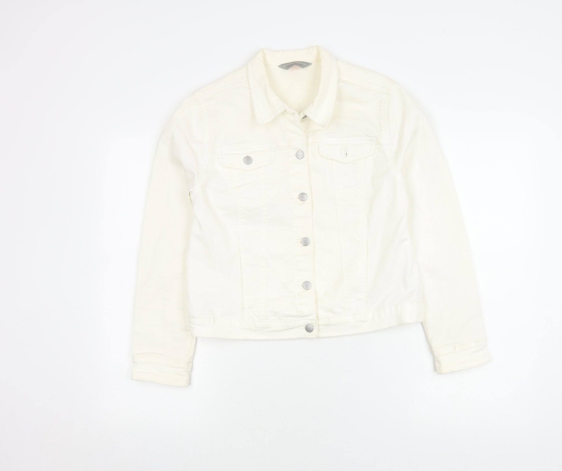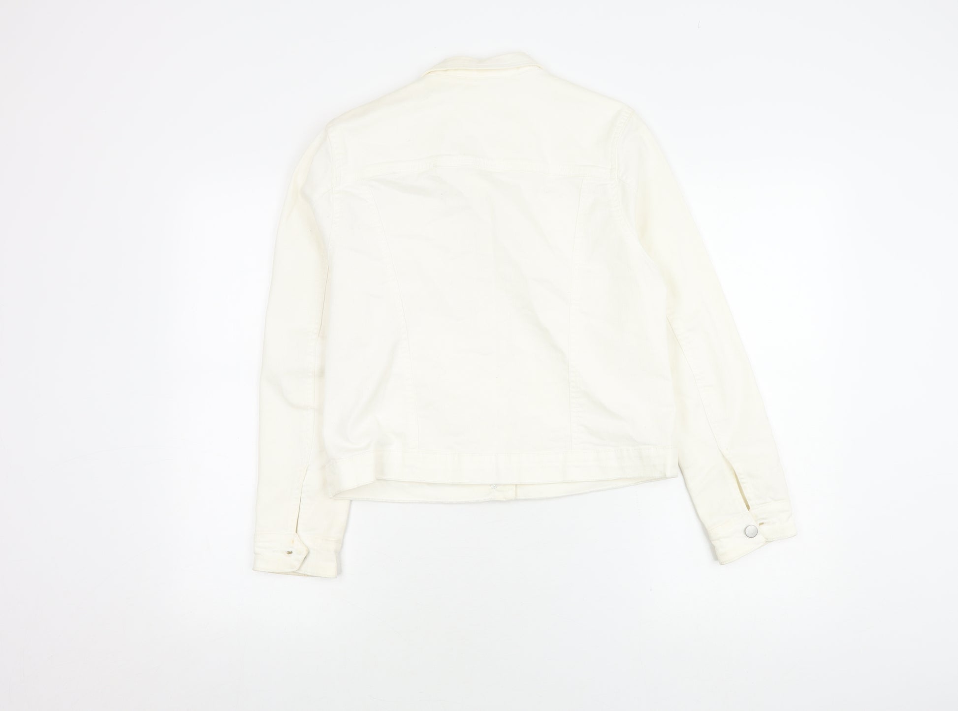 Embrace timeless style with this Dorothy Perkins basic jacket, designed exclusively for women. This elegant ivory jacket, crafted from a blend of cotton and elastane, ensures comfort and style. Its short length and classic twill fabric make it perfect for pairing with a variety of ensembles, whether for a casual day out or a relaxed evening meet-up. The jacket features a button closure that lends an understated yet chic accent to the overall look. Ideal for spring and autumn, its long sleeves provide a touch of warmth without compromising on style. In very good condition with only minor wear on the fabric, this piece remains machine washable, ensuring ease of care. Perfect for those who appreciate classic elegance and effortless fashion, this jacket offers a versatile addition to your wardrobe.