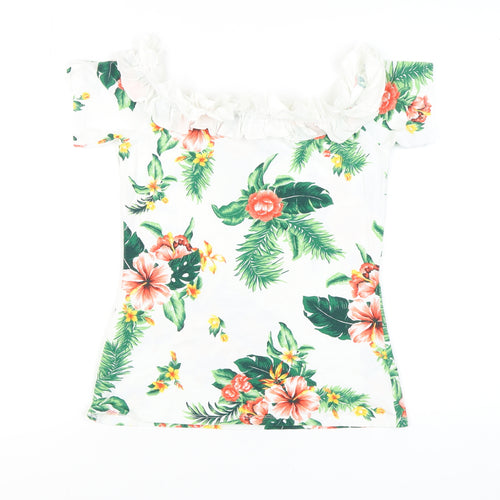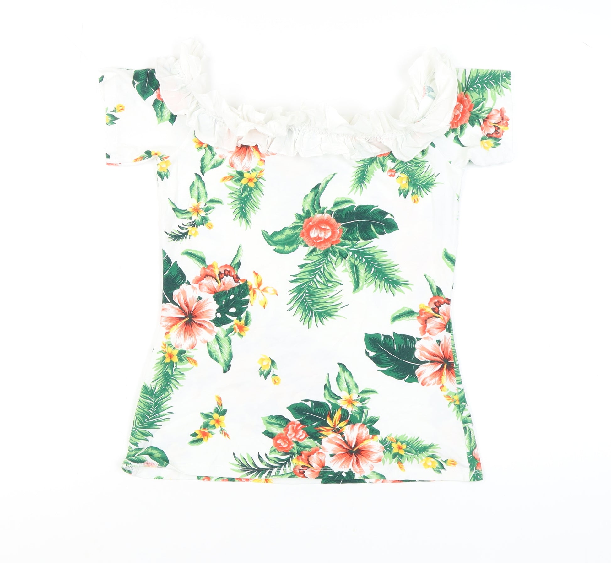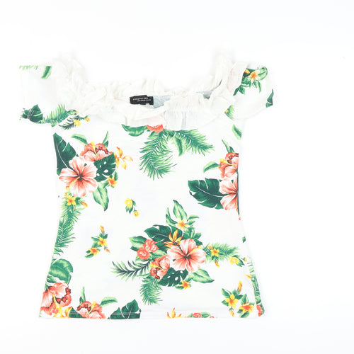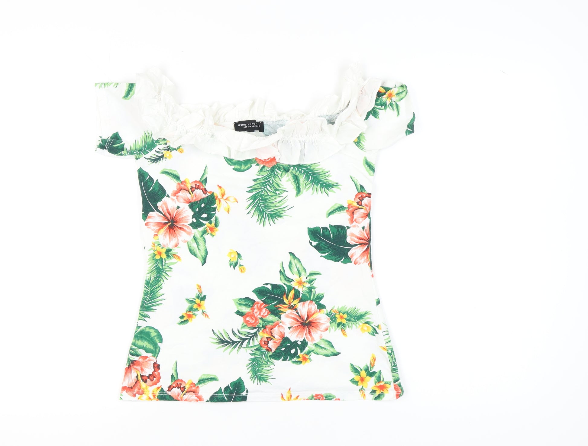Step into a tropical paradise with this stunning off-the-shoulder floral blouse from Dorothy Perkins. Perfect for those casual summer days, this vibrant piece will effortlessly elevate your wardrobe. Featuring a captivating multicoloured floral pattern, it adds a touch of whimsy and brightness to any outfit. Crafted from a soft blend of cotton and elastane, it ensures comfort while the gentle stretch provides a flattering fit. The ruffled off-the-shoulder neckline and short sleeves offer a trendy yet classic look. Ideal for pairing with jeans or a skirt, this blouse is your go-to for casual outings or beach vacations. With its regular fit and machine washable fabric, it's not only stylish but also easy to maintain. Despite being gently worn, it remains in excellent condition with no visible flaws. Grab this tropical essential and embrace the warm season with style. Don't miss out on adding this eye-catching piece to your collection!