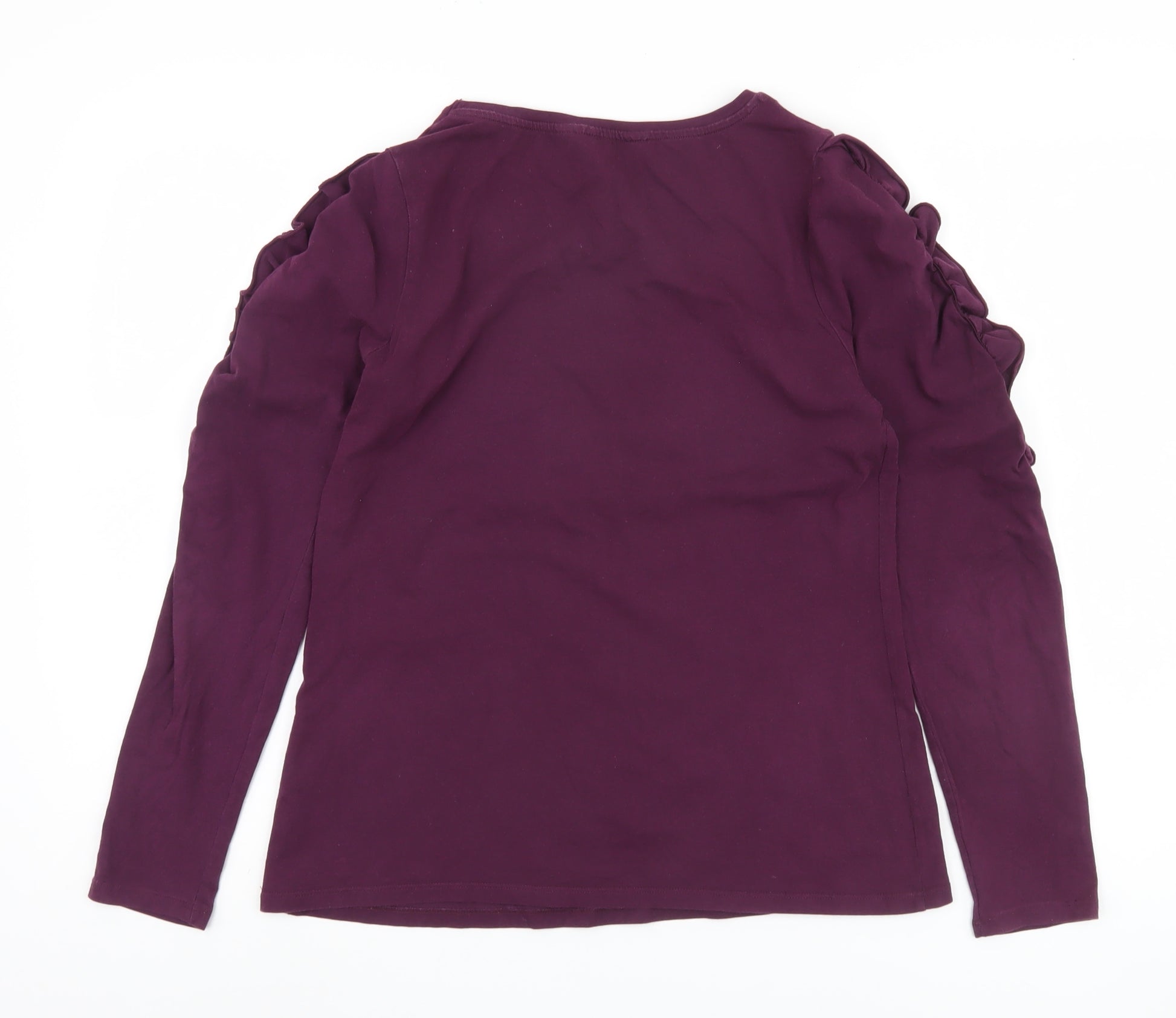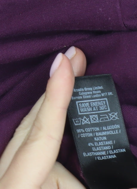 Elevate your wardrobe with this elegant and versatile Dorothy Perkins top, perfect for women seeking both style and comfort. Presented in a deep, rich purple tone, this long sleeve top features a classic round neck design that effortlessly flatters the silhouette. Crafted from a premium blend of 96% cotton and 4% elastane, it ensures a comfortable fit with a touch of stretch, making it ideal for everyday wear. The solid pattern brings a timeless simplicity, allowing you to easily pair it with any ensemble, from casual jeans to stylish skirts.Whether you're dressing for a casual day at the office or a relaxing weekend brunch, this top adapts seamlessly to your needs. Its sophisticated hue and quality fabric offer a polished appearance, while the easy-care nature of the material makes it practical for frequent use. Despite being gently worn, this piece remains in excellent condition, showing no signs of noticeable wear and ready to enhance any look it's paired with. Discover the perfect blend of fashion and functionality with this standout piece from Dorothy Perkins. Don't miss the opportunity to own a chic staple that will never go out of style.