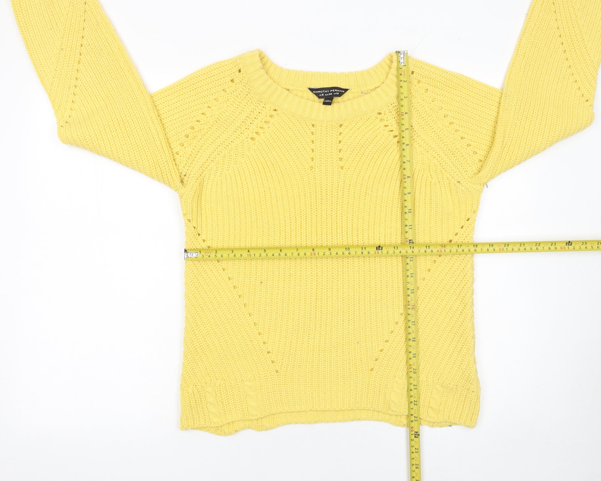 Brighten up your wardrobe with this sunny yellow jumper from Dorothy Perkins. Crafted from 100% acrylic, this soft and cosy pullover offers a comfortable fit with a touch of stretch to ensure ease of movement. The chunky-knit texture, combined with subtle cable detailing on the hem and structured raglan long sleeves, adds both charm and warmth, making it a versatile piece for cooler weather. Designed with a classic crew neckline and ribbed cuffs, it delivers both timeless style and practicality. Ideal for casual occasions, this jumper can be dressed down with jeans and trainers for a relaxed weekend look or paired with tailored trousers and ankle boots for a smart-casual finish. Lightweight yet snug enough for autumn, winter, and early spring, the breathable knit keeps you comfortably warm without feeling heavy. The cheerful yellow shade injects a pop of colour into any outfit, bringing brightness to grey days while complementing a wide range of skin tones. Easy to care for and machine washable, this piece is perfect for everyday wear. In excellent pre-owned condition with no visible flaws, it promises lasting quality and style. A must-have addition for women who appreciate vibrant yet effortless fashion, offering comfort, versatility, and a touch of sophistication in one simple staple. Complete your wardrobe with this beautifully made Dorothy Perkins jumper and enjoy effortless elegance throughout the seasons.