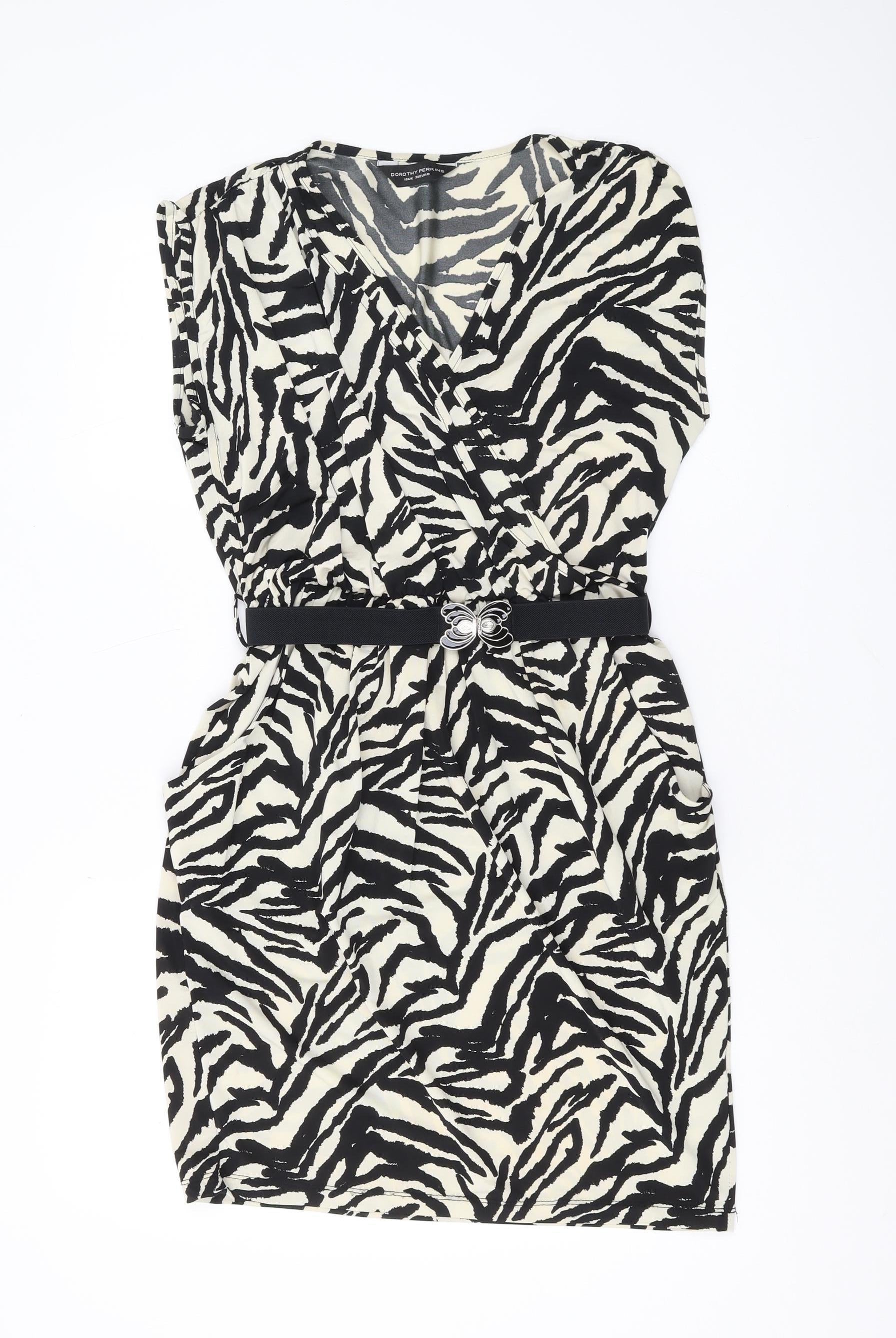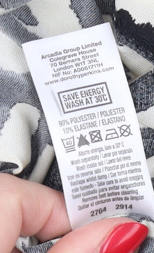 Step into style with this Dorothy Perkins wrap dress, a perfect blend of elegance and comfort. Designed for women who appreciate a chic look, this dress features a striking zebra animal print in classic black and white tones. The sleeveless design is perfect for layering or to be worn alone on warmer days, ensuring versatility throughout the seasons. This regular size 10 dress showcases a V-neckline that adds a touch of sophistication, enhancing your natural neckline beautifully. Crafted from a blend of polyester and elastane, the fabric provides a slight stretch for a comfortable fit, while the knit texture offers a soft and flattering drape on the body. The dress is machine washable, ensuring easy care and longevity in your wardrobe. A belted feature accentuates your waist, giving you a tailored look, while the wrap style design adds a timeless appeal suitable for various occasions. Ideal for office wear, casual outings, or even an evening gathering, its versatility will make it a staple piece in your collection. Whether paired with heels or flats, this dress is sure to make an impact. Update your collection with this elegant piece and experience the perfect mix of comfort and style.