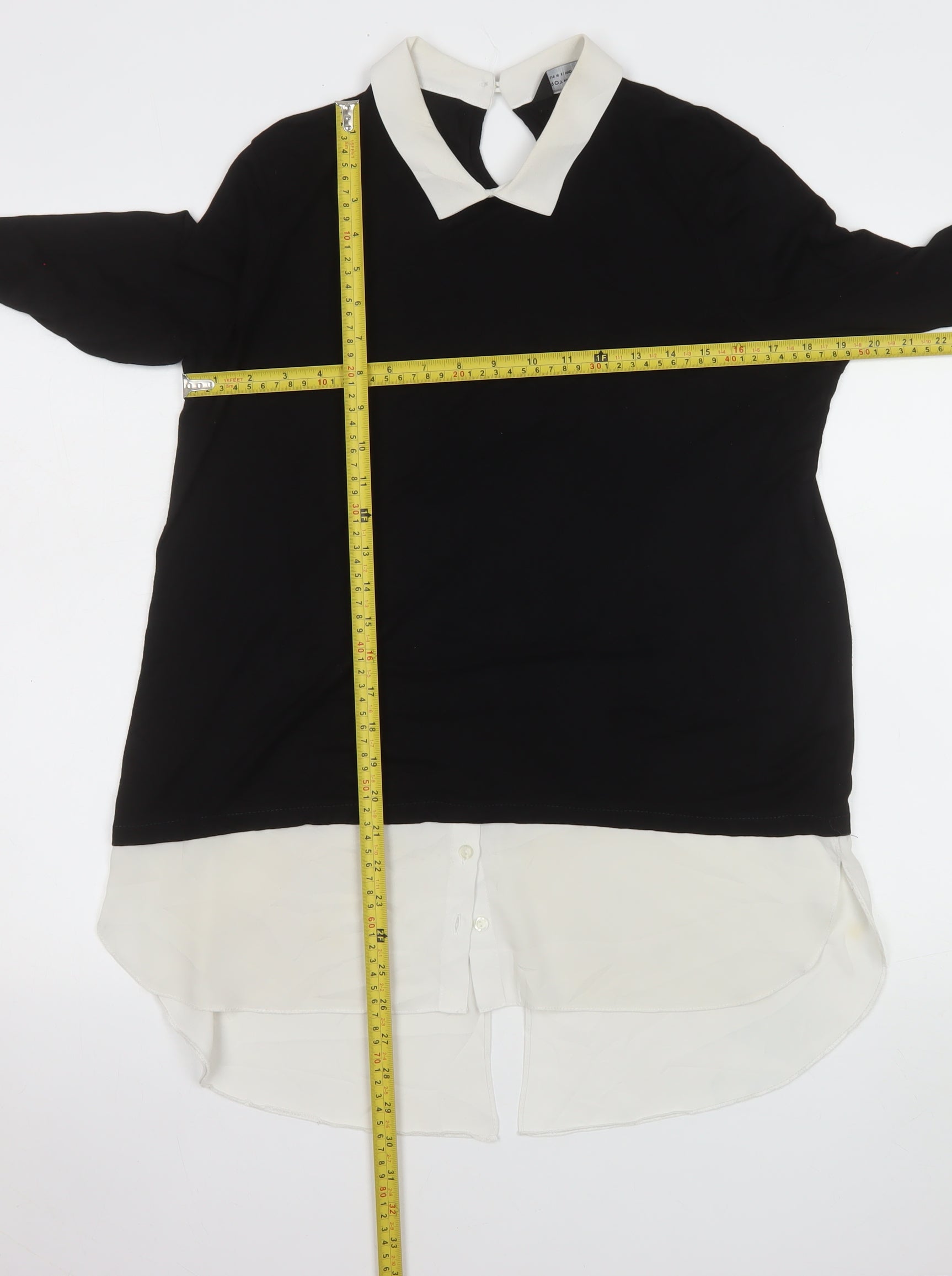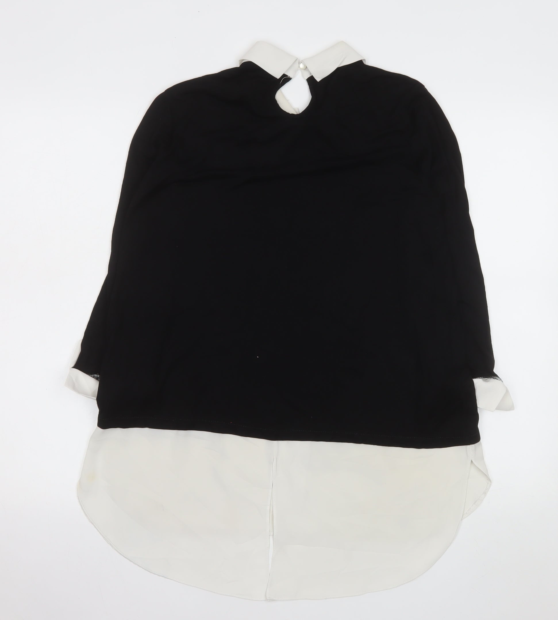 This elegant black and white blouse by Dorothy Perkins offers a smart yet comfortable style, perfect for both casual and workwear settings. Crafted for women in a regular size 14 fit, the blouse features a sophisticated collared neckline with a contrasting ivory layer detail at the hem and cuffs, creating the illusion of a layered shirt beneath a black top. The long sleeves and classic cut give it a timeless silhouette suitable for autumn, winter, and early spring. The blouse is made from a soft jersey blend of 96% viscose and 4% elastane, allowing for a breathable yet flexible wear that sits comfortably throughout the day. A small back button closure adds subtle elegance, while the simple solid pattern in black ensures versatility for pairing with trousers, skirts, or jeans. Whether you’re heading to the office, attending a semi-formal gathering, or enjoying a smart-casual day out, this piece offers effortless polish. Despite its overall excellent appearance, there is a very small, faint stain on the lower white hem, which does not detract from its overall stylish presentation. Offering quality craftsmanship and an enduring design, this blouse embodies classic Dorothy Perkins sophistication at an affordable price. A must-have staple for any wardrobe, ideal for those who value comfort, modern tailoring, and feminine simplicity. Add it to your collection for a refined look that transitions seamlessly from workday to weekend wear, pairing perfectly with a blazer or light cardigan for a complete ensemble.