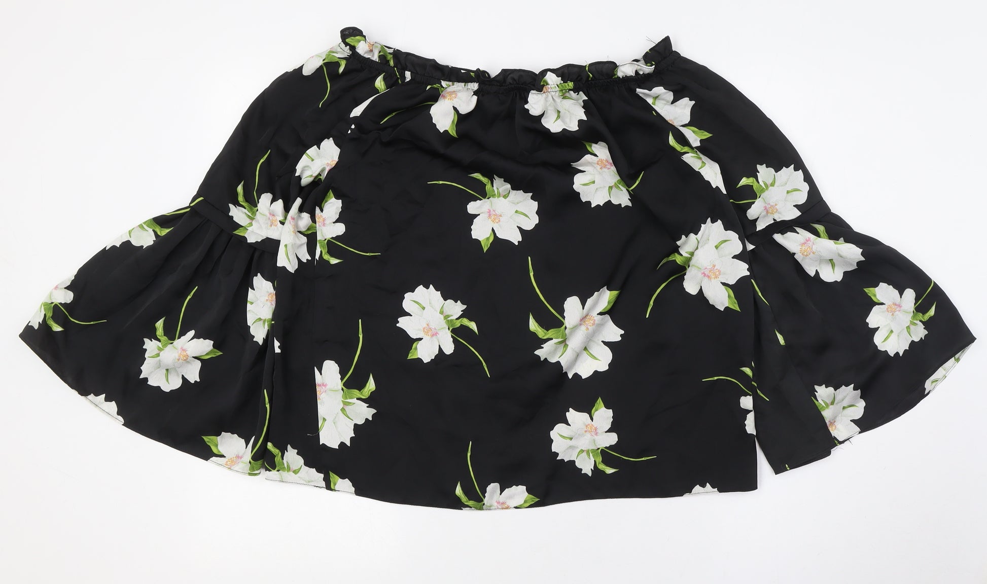 Womens Black Floral Polyester Basic Button-Up Size 12 Off the Shoulder