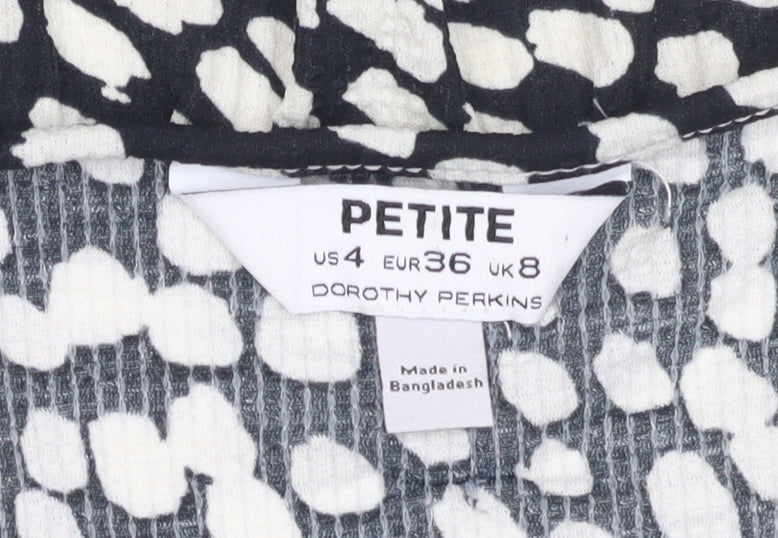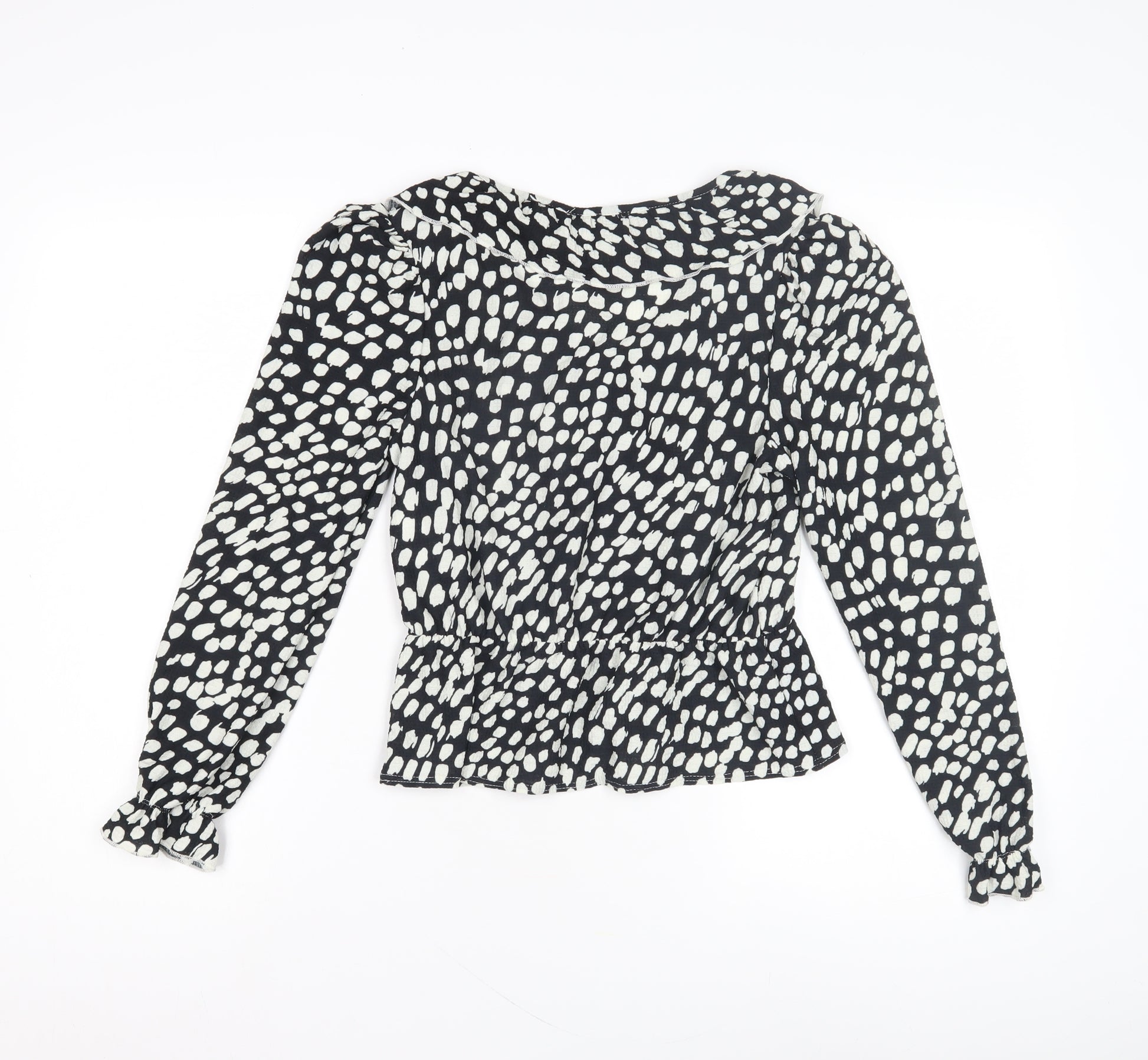 This blouse by Dorothy Perkins is a staple item that is perfect for any casual occasion. Fashioned in black with a distinctive geometric pattern, this top exudes sophistication and charm. The comfortable cotton material makes it easy to wear all day long, while the V-neck design is enhanced by ruffle accents that add a playful touch. The blouse is crafted for women who favour a fashionable yet relaxed style. With its long sleeves, it's perfect for pairing with your favourite jeans or a sleek skirt for a complete look. Notably, this piece is machine washable, making it a practical choice for the busy fashionista. It's in excellent condition, ensuring you get an item that looks almost brand new. Elevate your everyday wear with this stylish blouse that combines comfort, elegance, and effortless style, all in one beautifully designed piece from Dorothy Perkins.