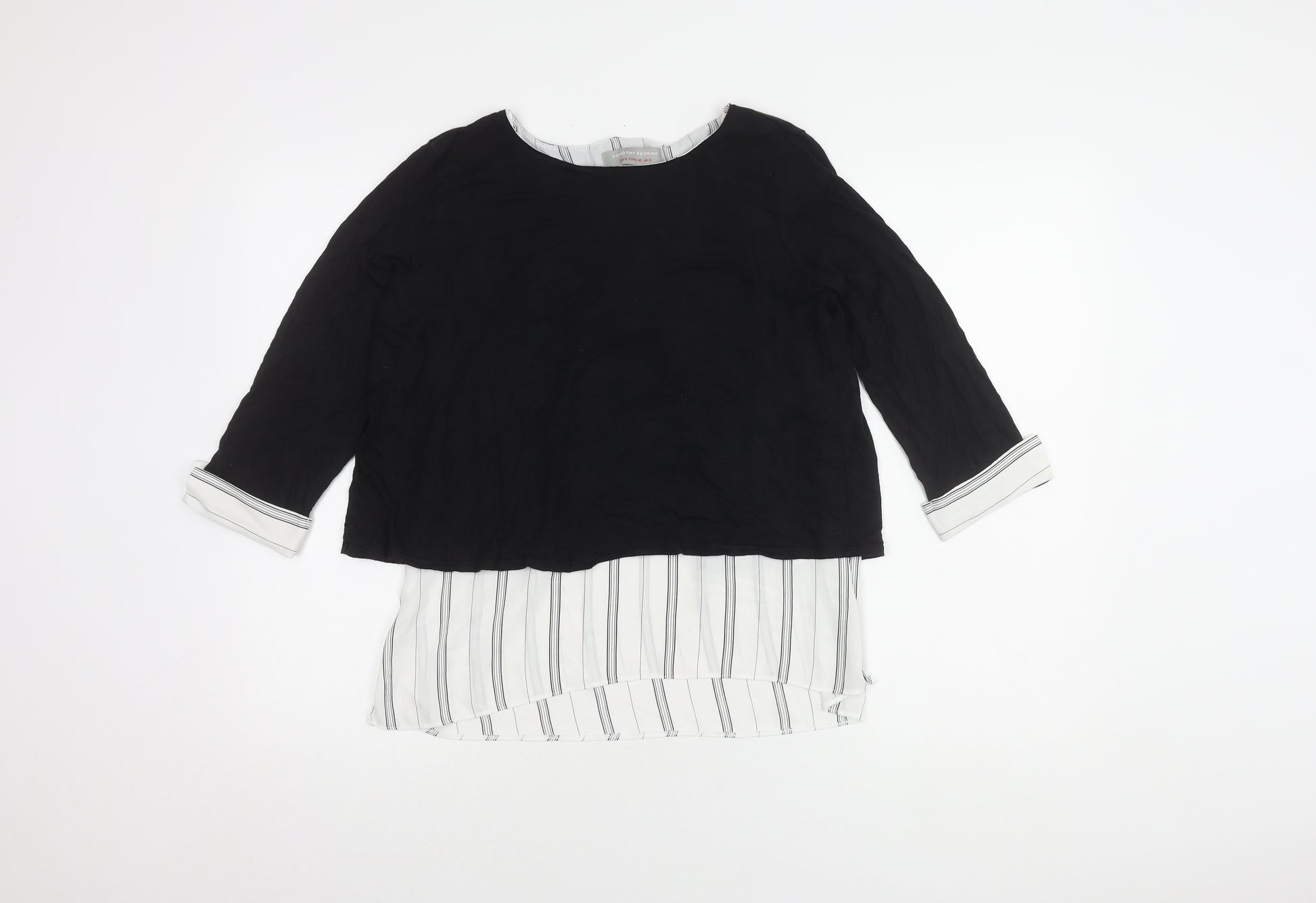 Explore sophistication and style with this elegant Dorothy Perkins top, perfectly tailored for the fashion-forward woman looking to elevate her everyday wardrobe. Made from a blend of soft viscose and stretchy elastane, this top guarantees a comfortable fit that drapes beautifully. The classic round neck design complements the structured stripes, creating a timeless aesthetic that's ideal for both work and casual outings. Black and white tones ensure versatility, while the 3/4 sleeves add a modern touch. Practicality meets style with the zip closure, making it easy to wear and perfect for layering. Whether you're meeting friends or attending a casual brunch, this top transitions seamlessly through seasons, promising to be a staple in your wardrobe. In excellent condition with no signs of wear, this piece offers the luxurious feel Dorothy Perkins is known for, without the high price tag. Pair this top with your favourite trousers or a stylish skirt to create a chic ensemble that can be dressed up or down for various occasions.