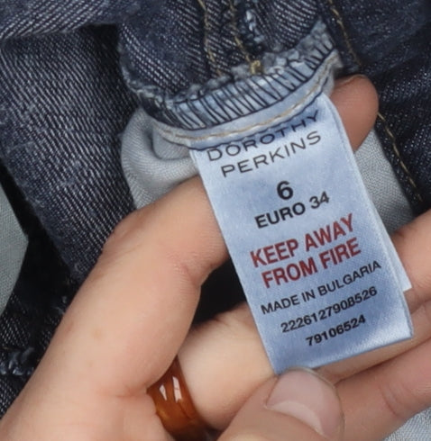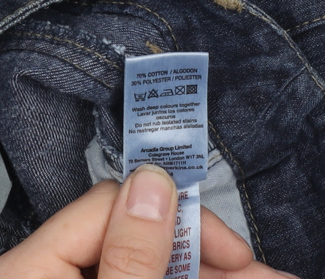 Step out in style with this Dorothy Perkins denim skirt, perfect for adding a touch of casual sophistication to your wardrobe. Crafted from a durable blend of cotton and polyester, this knee-length pencil skirt showcases a classic straight cut that flatters the silhouette. Designed for comfort and practicality, the skirt features a convenient zip and button closure, along with the timeless appeal of denim fabric. The rich blue hue is versatile enough to pair with a variety of tops, making it an ideal choice for everyday wear or casual outings. Fringe accents lend a trendy edge to this otherwise classic skirt, ensuring you can transition seamlessly from day to evening wear with ease. The skirt is equipped with practical pockets, perfect for keeping small essentials close at hand. Despite its pre-loved nature, this skirt remains in very good condition with light wear and no visible defects, promising enduring quality and style. Easy to care for, this garment is machine washable, allowing for low maintenance upkeep. Complete your ensemble with a pair of your favourite sandals or boots this autumn, spring, or summer. Elevate your wardrobe with this versatile and stylish skirt, ideal for everyday casual occasions.