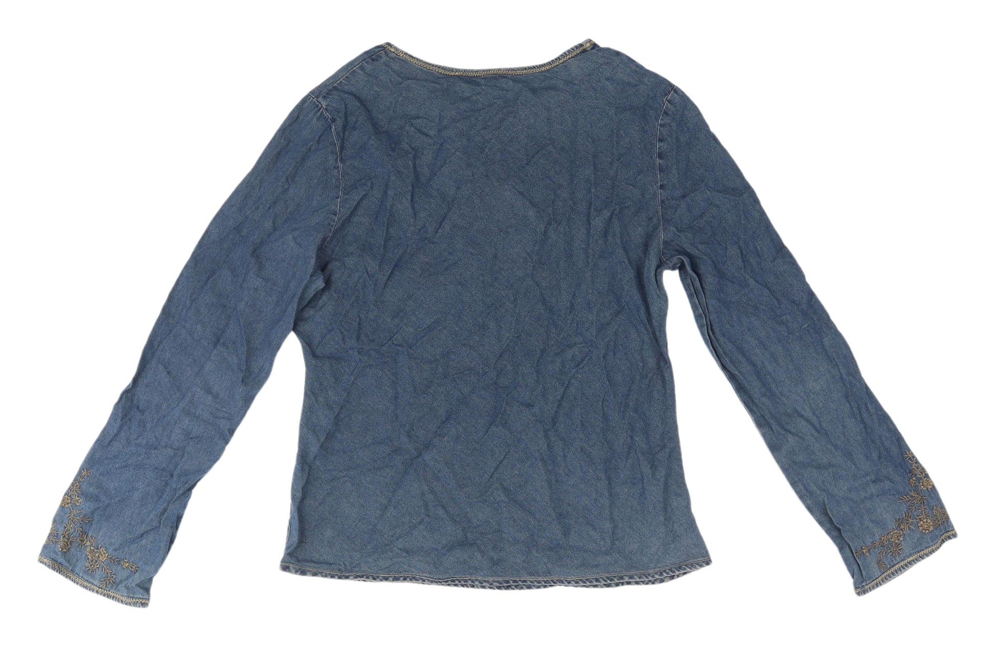 This Dorothy Perkins top is a chic addition to your casual wardrobe. Crafted from 100% breathable cotton, its denim fabric and solid blue hue offer a timeless appeal. The top features elegant embroidery accents, adding a touch of sophistication. Designed with a flattering V-neckline and long, fitted classic sleeves, it provides both style and comfort. Ideal for all seasons, its versatility makes it a perfect choice for various occasions, from casual outings to leisure activities. In excellent condition, this top shows slight wrinkles but lacks original sales tags, ensuring it's ready for new adventures. Elevate your style effortlessly with this distinguished piece.