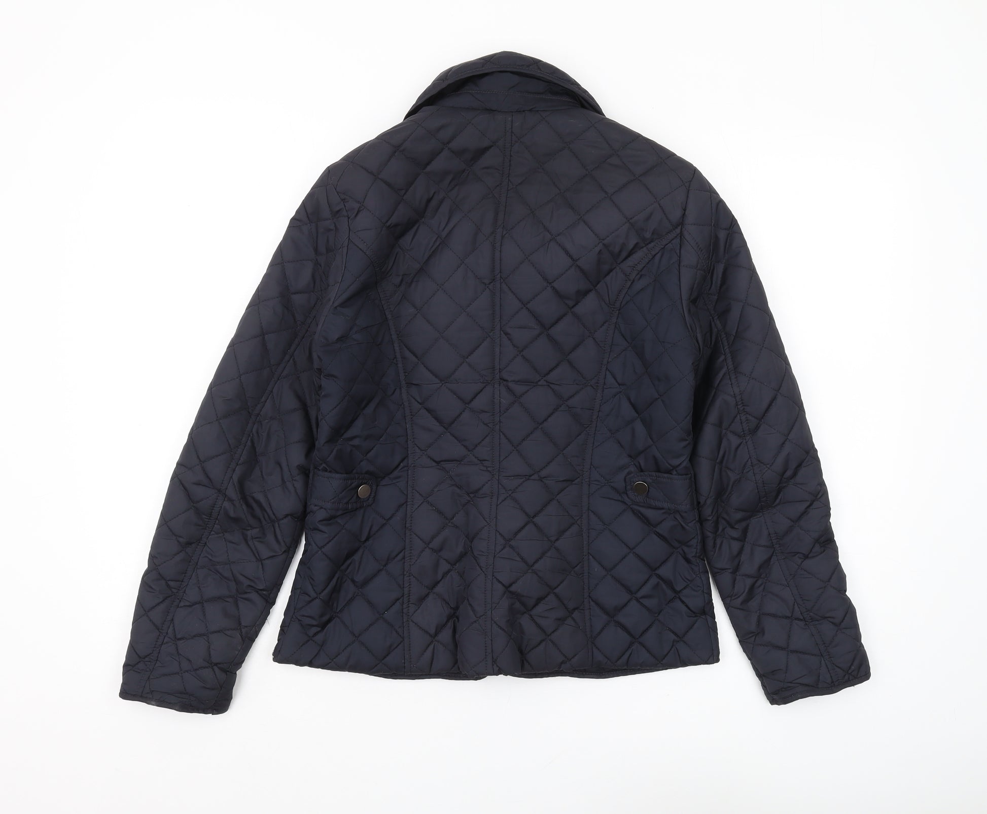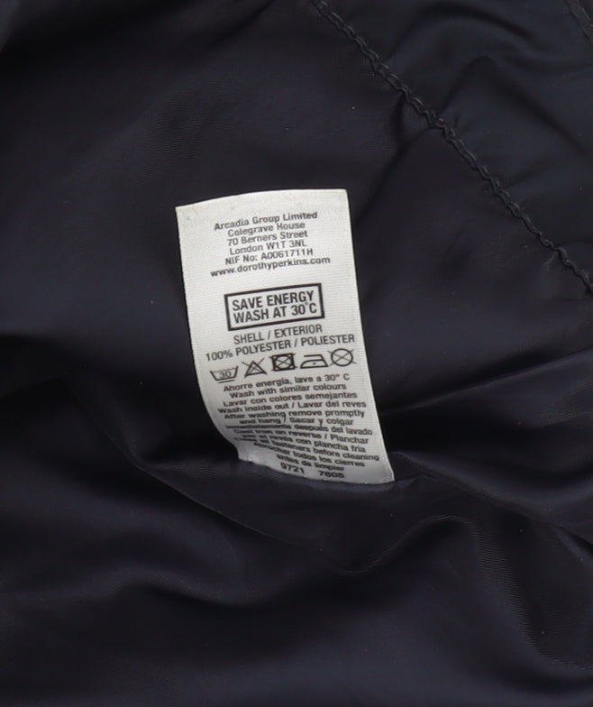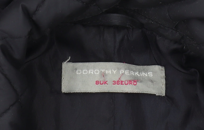 Step into style with this elegant Dorothy Perkins blue quilted jacket, perfect for the chilly autumn and winter months. Crafted for the modern woman, this regular size 8 jacket features a timeless collared design and a classic button closure. Its exquisite quilted style is versatile and chic, offering a polished look for casual outings or a day at the park. The 100% polyester outer shell promises durability and ease of care, making it machine washable for your convenience. With its comfortably lined interior, this mid-length jacket offers warmth and flexibility whether you're layering over a casual T-shirt or pairing with your favourite scarf. The deep blue hue is a standout choice, adding a touch of elegance to any wardrobe. Practical as well as stylish, its structure is designed to flatter the figure with a regular fit, while the long sleeves provide a cosy feel. Ideal for casual occasions, this jacket effortlessly blends functionality with fashion, making it a worthy addition to your clothing collection. Easily matched with your existing wardrobe, it's an investment in style that's sure to become a favourite go-to piece.