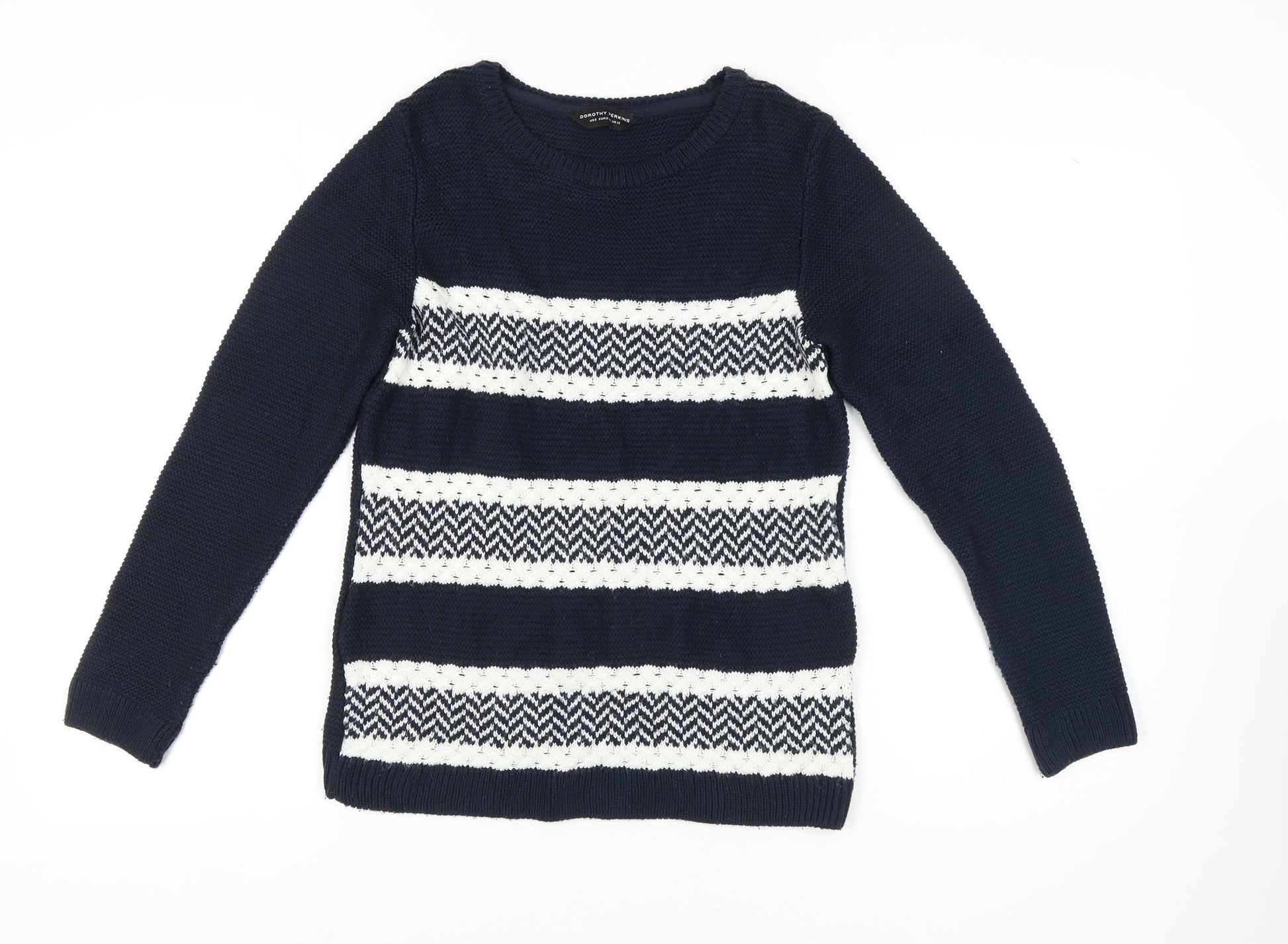 Elevate your winter wardrobe with this stylish Women's Blue Striped Jumper by Dorothy Perkins. Available in size 12, this jumper combines fashion and comfort effortlessly. Crafted from a tight-knit fabric, it features a classic crew neck and long sleeves, ensuring warmth during the chilly autumn and winter months. The blue hue, enhanced by striped patterns, offers a timeless look that pairs well with both jeans and skirts for a versatile outfit. Comprised of 100% acrylic, this jumper is not only soft and durable but also machine washable for easy care. Whether you're at a casual meet-up or a relaxed weekend at home, this jumper makes the perfect companion, offering both style and comfort. No visible brand sales tags indicate it’s gently used, yet it remains in excellent condition. Embrace the cold season with this elegant piece that promises to keep you cosy and chic.