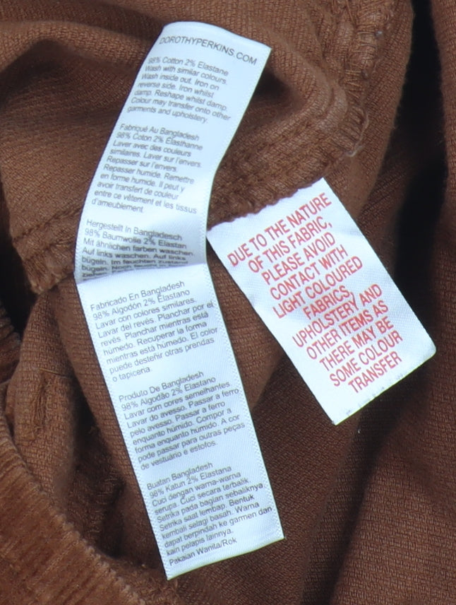 Elevate your wardrobe with this stylish brown corduroy skirt from Dorothy Perkins, perfect for autumn wear. Tailored in a size 16, this skirt combines classic design with a comfortable fit, thanks to its refined cotton and elastane blend. The skirt features a button closure and practical pockets, making it a versatile piece for everyday casual outings. With its rich brown hue, it is easy to match with a variety of tops, adding warmth and texture to your look. The corduroy fabric, known for its durability and softness, ensures that you stay both cosy and chic. Despite being gently used, it is in excellent condition with no noticeable defects. Whether you're heading to work or out for a weekend brunch, this skirt will be your go-to piece when you want a touch of elegance with a vintage vibe. Don't miss out on this fantastic addition to your seasonal collection, offering both style and comfort in one timeless garment.