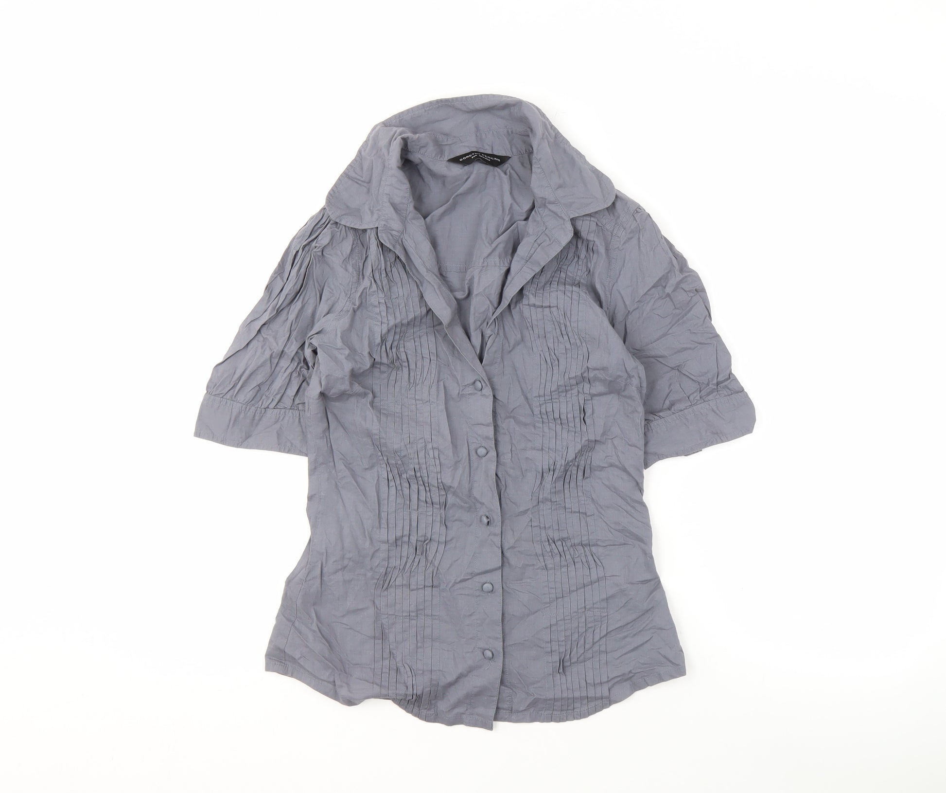 Elevate your wardrobe with this elegant Dorothy Perkins button-up shirt in a versatile grey hue. Tailored in a regular fit, it is perfect for both casual and workwear settings. The shirt features a classic collared neckline and 3/4 sleeves, offering a sophisticated yet comfortable style. Made from 100% cotton, it ensures a soft touch and breathable comfort, making it ideal for spring and summer. Despite being pre-owned, the shirt is in excellent condition with only minor wrinkles, retaining its charm and functionality. With easy care instructions, this piece is machine washable, allowing for convenient upkeep. The timeless grey colour pairs effortlessly with various outfits, making it a staple in any woman's wardrobe. Don't miss out on adding this stylish and versatile piece to your collection.