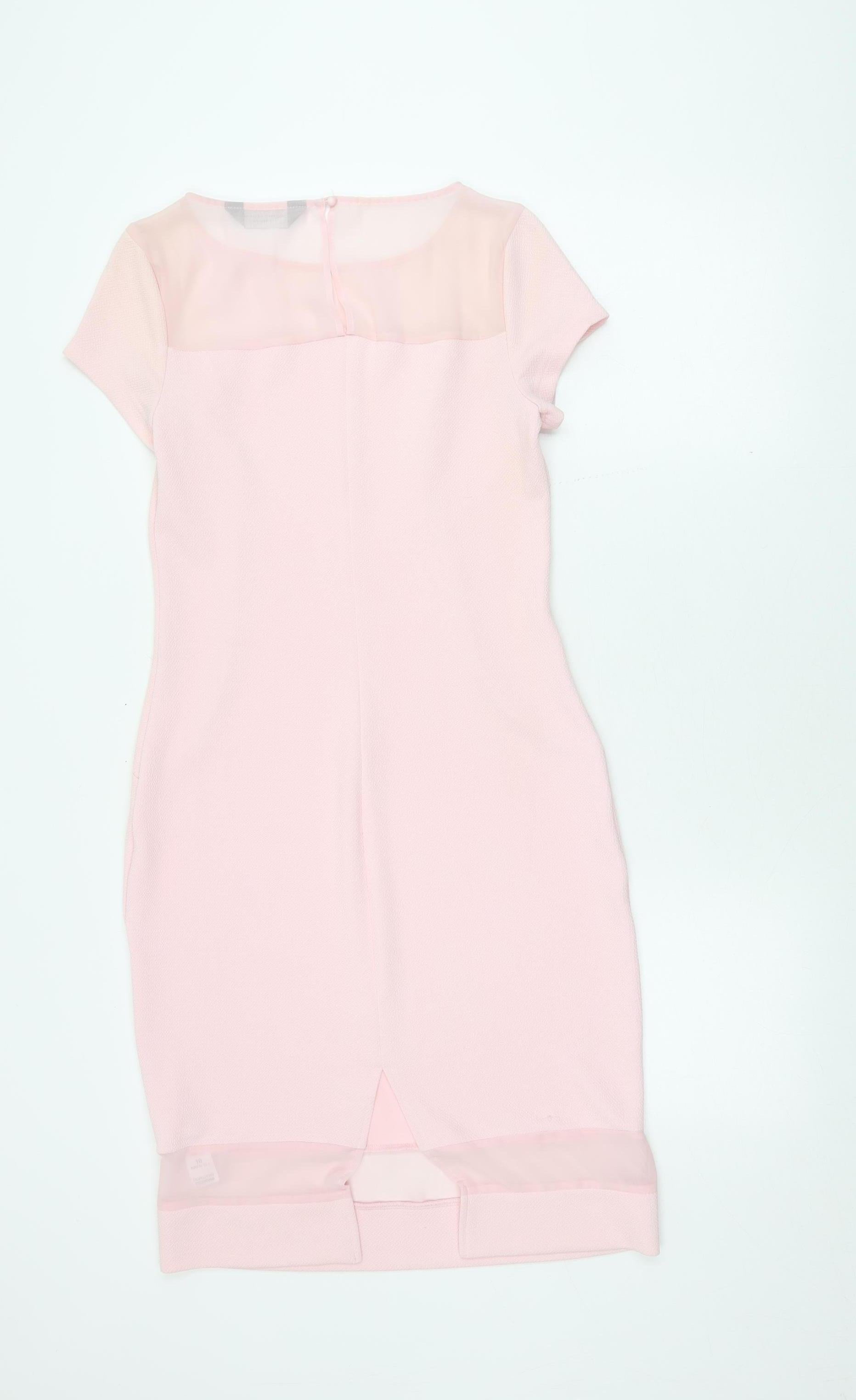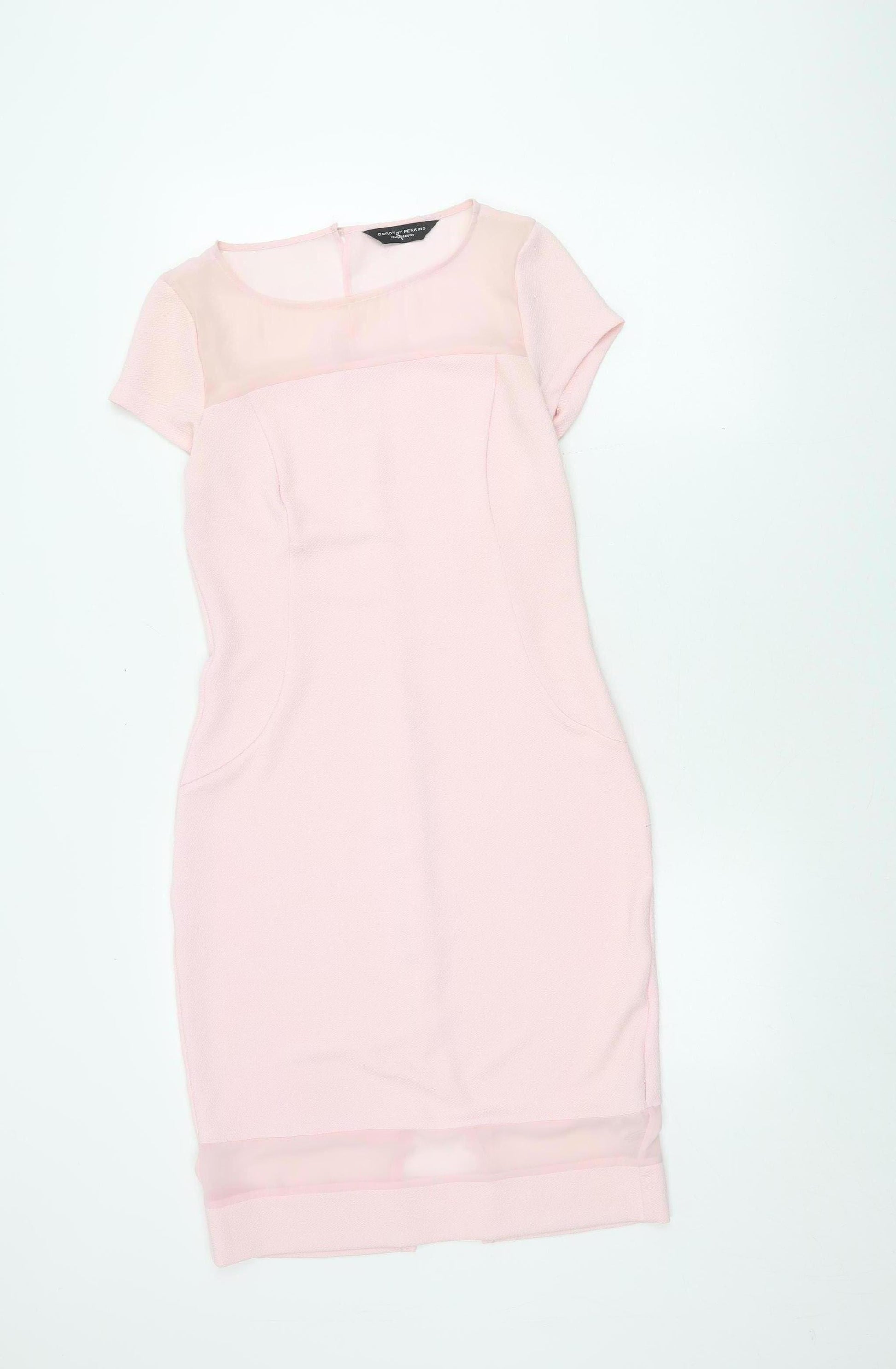 Elevate your wardrobe with this beautiful pink sheath dress from Dorothy Perkins, perfect for both casual outings and cocktail parties. Crafted for the modern woman, this dress features a classic round neckline and elegant short sleeves, ensuring a sophisticated yet playful silhouette. Made from a lightweight polyester and elastane blend, it provides a comfortable fit, moving effortlessly with your every step. The short, sheath style offers a flattering shape, making it a versatile choice for spring and summer gatherings. Enclosed with a discreet zip at the back, this dress holds a clean and seamless appearance. In excellent condition, free from visible wear or stains, this dress is ready to be a staple in your collection. Whether dressing up for a night out or enjoying a leisurely day, this Dorothy Perkins dress will add a touch of elegance to your look.