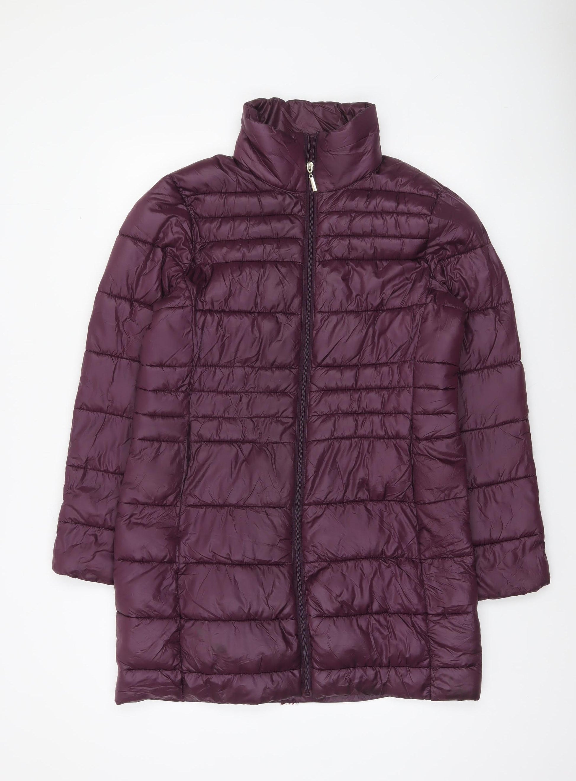 Stay cosy and stylish through the colder months with this beautiful women's purple puffer coat from Dorothy Perkins. Designed in a rich plum shade, this mid-length coat provides both practicality and elegance for everyday wear. The lightweight quilted design ensures warmth without the bulk, ideal for autumn and winter outings. Featuring a full zip closure and high collar, it offers excellent comfort and protection against chilly winds. The coat is crafted from durable 100% polyamide on the outer and lining, while the wadding is made from 100% polyester for lightweight insulation. The smooth texture provides a sleek, modern look suitable for pairing with jeans, boots, or smart casual attire. With a flattering regular fit, this coat is designed for comfortable everyday wear, making it perfect for travel, casual days, or city strolls. Functional features such as being lined, insulated, and lightweight ensure easy layering and reliable warmth. Subtle quilted accents and a clean silhouette add sophistication to its practical appeal. A versatile wardrobe essential, this Dorothy Perkins puffer coat brings together durability, comfort, and timeless style. Condition is very good with only light signs of previous wear near the hem, showing minimal use. Machine washable for easy care. A great value outerwear choice that balances function and fashion for the season ahead.