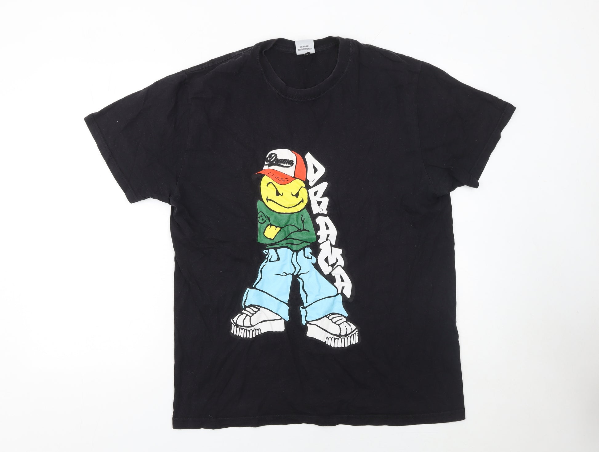 Express your individuality with this eye-catching black graphic T-shirt from Drama Call. Designed for men who love casual streetwear with a playful edge, this tee effortlessly merges bold style with comfortable wearability. Crafted from soft and breathable 100% cotton, the fabric ensures all-day comfort while maintaining its shape through repeated wear. Featuring a classic crew neckline and short sleeves, this regular-fit top embodies laid-back versatility. The standout feature is the vivid cartoon-style print on the front, depicting a cool animated character with oversized trainers and baggy jeans, radiating 90s nostalgia and attitude. The graphic design infuses the T-shirt with personality, making it ideal for everyday wear, festivals, or casual outings. The black background allows the bright, colourful print to truly pop, adding a vibrant edge to your wardrobe. Whether paired with jeans, cargo shorts, or joggers, this Drama Call tee easily becomes a statement piece that reflects your fun and bold taste in fashion. Perfect for spring, summer, and autumn, it suits a variety of casual occasions and can be layered under a jacket in cooler weather. The breathable cotton jersey material is machine washable, offering easy care and durability. This T-shirt remains in very good pre-owned condition, showing only light signs of wear with no major flaws. A great value addition for those who appreciate expressive streetwear and graphic design. Add this unique Drama Call black graphic print T-shirt to your collection and showcase your effortless cool style today.