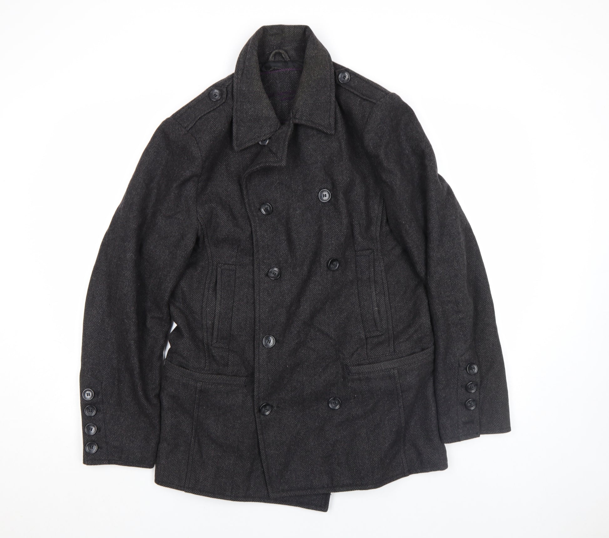 This Dreamweaver London men's pea coat is a sophisticated and stylish outerwear option crafted to provide both comfort and timeless charm. Made from a high-quality wool blend featuring 60% wool and 40% polyester, it delivers a warm and durable layer ideal for cool autumn and winter days. The fabric exhibits a traditional herringbone pattern that adds texture and depth, highlighting its classic British tailoring influence. Designed in a mid-length cut, the coat ensures versatile styling suitable for both business and casual occasions, helping elevate your wardrobe with a refined touch. The coat includes a double-breasted button closure, structured collar, and functional front pockets that merge utility with modern urban style. Further enhancing its elegance, it features buttoned cuffs and a rear belt detail for added fit definition and visual appeal. The interior is fully lined in smooth black polyester for comfort and ease of layering. Presented in an attractive dark grey colour, the coat coordinates effortlessly with smart trousers, denim, or chinos for a polished finish. Ideal for men who appreciate classic sophistication, this piece reflects quality craftsmanship with attention to detail throughout its construction. Condition is excellent, showing only minimal signs of previous wear with no visible marks or defects. It has been gently used and well cared for, ready to wear without any need for restoration. If you’re seeking reliable, stylish outerwear capable of complementing a range of outfits, this wool-blend Dreamweaver London pea coat makes a high-quality investment. Perfect for the cooler months, it is tailored to balance warmth, durability, and timeless style with everyday practicality. Suitable for work commutes, weekend outings, or smart-casual events, this piece makes an adaptable addition to any modern wardrobe looking for enduring quality and elegance.