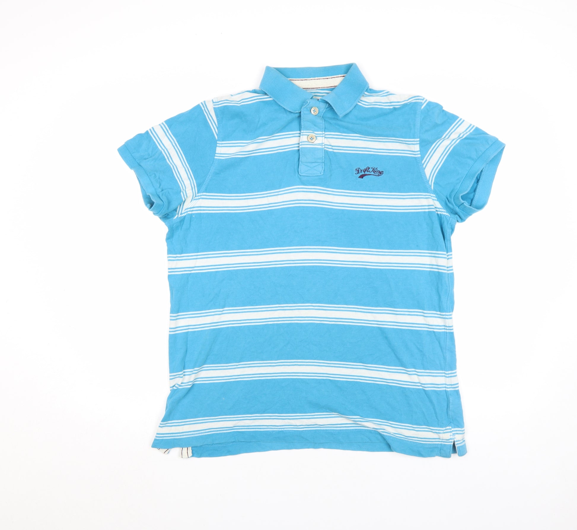 Step into effortless everyday style with this Drift King men's blue striped polo shirt in size M. Crafted from 100% cotton, this short sleeve polo offers breathable comfort and a lightweight feel, ideal for warm-weather days or casual smart-casual occasions. The crisp blue and white striped pattern gives a timeless, sporty aesthetic, while the collared neckline and button placket add a neat finishing touch that transitions easily from a day out to an informal evening meet-up.Drift King’s long-standing reputation for authentic casual design since 1971 is reflected in the attention to detail seen here, including subtle logo embroidery on the chest and durable stitching along the seams for everyday wear. The soft jersey fabric ensures all-day comfort, maintaining its shape through washes thanks to its high-quality cotton composition.This polo pairs effortlessly with jeans, chinos, or shorts, making it a versatile staple in any wardrobe. The classic regular fit flatters most body types, offering ease of movement without feeling oversized. Perfect for casual outings, holidays, or relaxed Fridays at work, this Drift King polo shirt embodies reliable comfort and refined simplicity.In very good pre-owned condition with minimal signs of previous wear, this top retains excellent colour and structure. It’s machine washable for easy care and built for enduring, comfortable wear in spring and summer seasons. Add this Drift King polo to your collection for a smart yet relaxed go-to piece that complements both sunny and layered looks.
