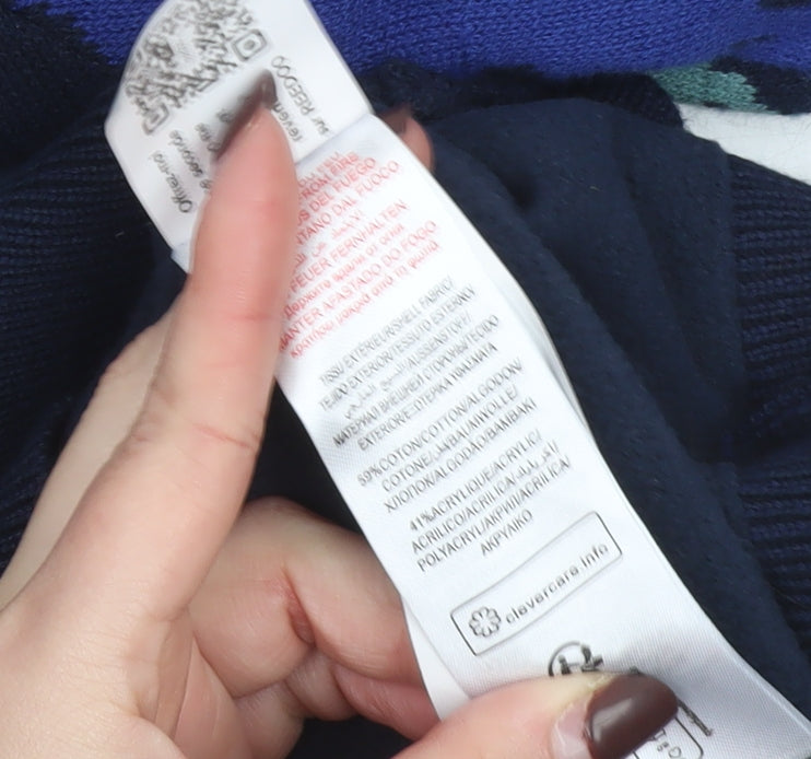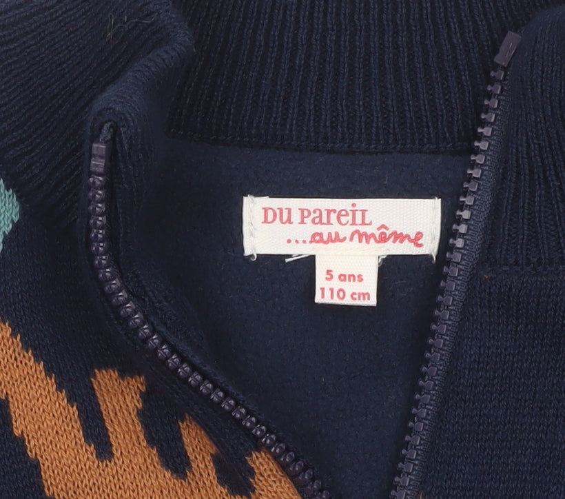 Keep your little one warm and stylish with this fun and cosy Du Pareil au Même boys’ full zip cardigan. Designed in a rich navy-blue base with an all-over dinosaur pattern in shades of green, blue, and brown, it’s perfect for young dinosaur lovers. The vibrant design makes it a playful yet practical choice for everyday wear, whether for school, play, or casual outings. Made from a soft and durable cotton-acrylic blend, this knit jumper offers both comfort and easy care, keeping your child warm during the cooler seasons while maintaining breathability. The ribbed cuffs, hem, and collar provide a snug fit, helping to keep warmth in and chill out. The front zip closure makes dressing easy—a handy feature for independent little ones. Ideal for layering over tees or wearing under jackets, this cardigan is a versatile wardrobe staple that combines comfort and personality. With its sturdy workmanship and cheerful print, it’s a great piece for everyday adventures while adding a touch of character and fun to any outfit. In excellent pre-loved condition with no visible flaws or stains, it shows only minimal signs of wear. Perfect for autumn, winter, and spring, this cosy cardigan delivers both fashion and function for your little explorer.