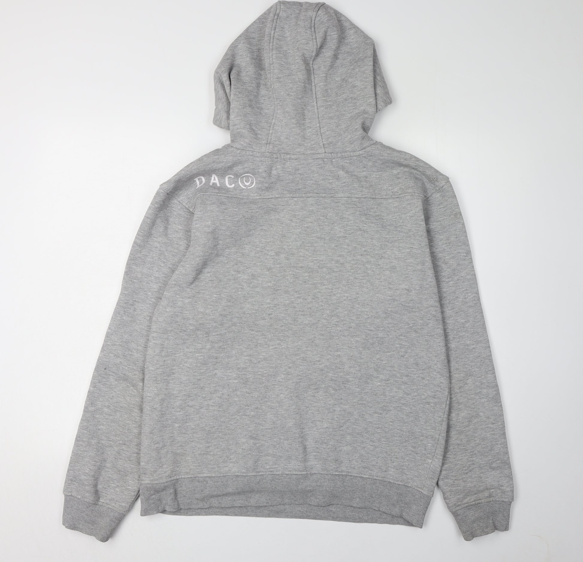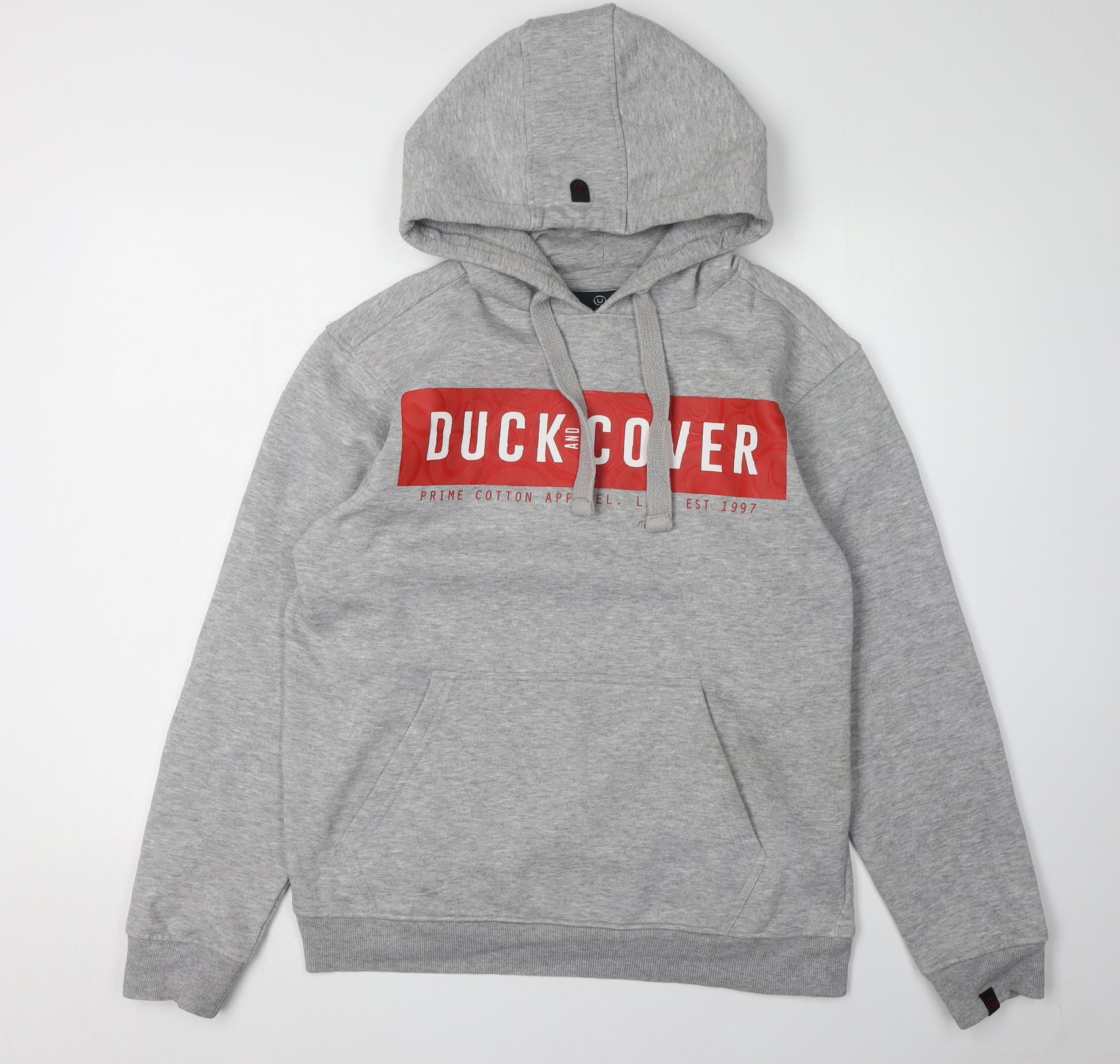 Elevate your casual wardrobe with this Duck and Cover grey pullover hoodie, an excellent addition for any fashion-conscious individual. Crafted from a comfortable blend of 60% cotton and 40% polyester, this hoodie ensures a snug fit while providing durability and style. Its regular fit and long sleeves make it an ideal choice for the autumn and winter months, ensuring warmth without compromising style. The hoodie features a distinct logo accent and a graphic print that adds a touch of urban flair to any outfit. Equipped with practical drawstring closure and a spacious front pocket, it offers convenience in addition to its modern aesthetic. Designed for men, this jersey fabric hoodie is machine washable, making it easy to care for despite frequent use. Whether you're heading out for a casual hangout or looking to stay comfortable on a laid-back day, this Duck and Cover hoodie promises to be a reliable choice. Although pre-loved, it remains in excellent condition with only minimal signs of wear, making it a great find for the style-savvy shopper. Add this wardrobe staple to your collection and enjoy a blend of comfort, practicality, and contemporary design.