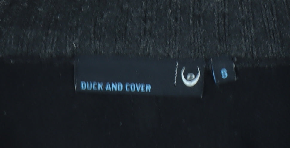 Elevate your casual wardrobe with this refined Duck and Cover men's black jumper, crafted from a soft and durable blend of 50% wool and 50% acrylic. Designed with comfort and practicality in mind, this high-neck half-zip style offers both warmth and versatility — perfect for layering over shirts or wearing on its own during cooler months. The clean, minimal design gives it a contemporary edge, while the ribbed detailing along the cuffs, collar, and hem provides a structured fit that flatters the wearer. Ideal for everyday wear, this jumper combines functionality with modern street-inspired style.The rich black hue makes it an adaptable wardrobe staple that effortlessly complements jeans, chinos, or casual trousers. Its understated look is enhanced by the subtle branding detail on the sleeve, showcasing the Duck and Cover signature quality. Constructed in a tight-knit texture, it delivers a premium feel that retains shape while ensuring breathability for year-round comfort. Suitable for layering in colder weather or as a standalone top for a refined casual look, this jumper is perfect for autumn and winter wear.Whether you're heading out for a relaxed evening or dressing up your everyday ensemble, this Duck and Cover piece achieves an ideal balance of warmth, durability, and understated style. Its easy-care nature also means low maintenance without compromising on quality. Gently used and in excellent condition with only minimal signs of wear and light lint, it’s a high-quality addition to any man’s wardrobe. A reliable, stylish jumper that exudes effortless cool and enduring comfort — an essential for those who appreciate classic style with modern practicality.