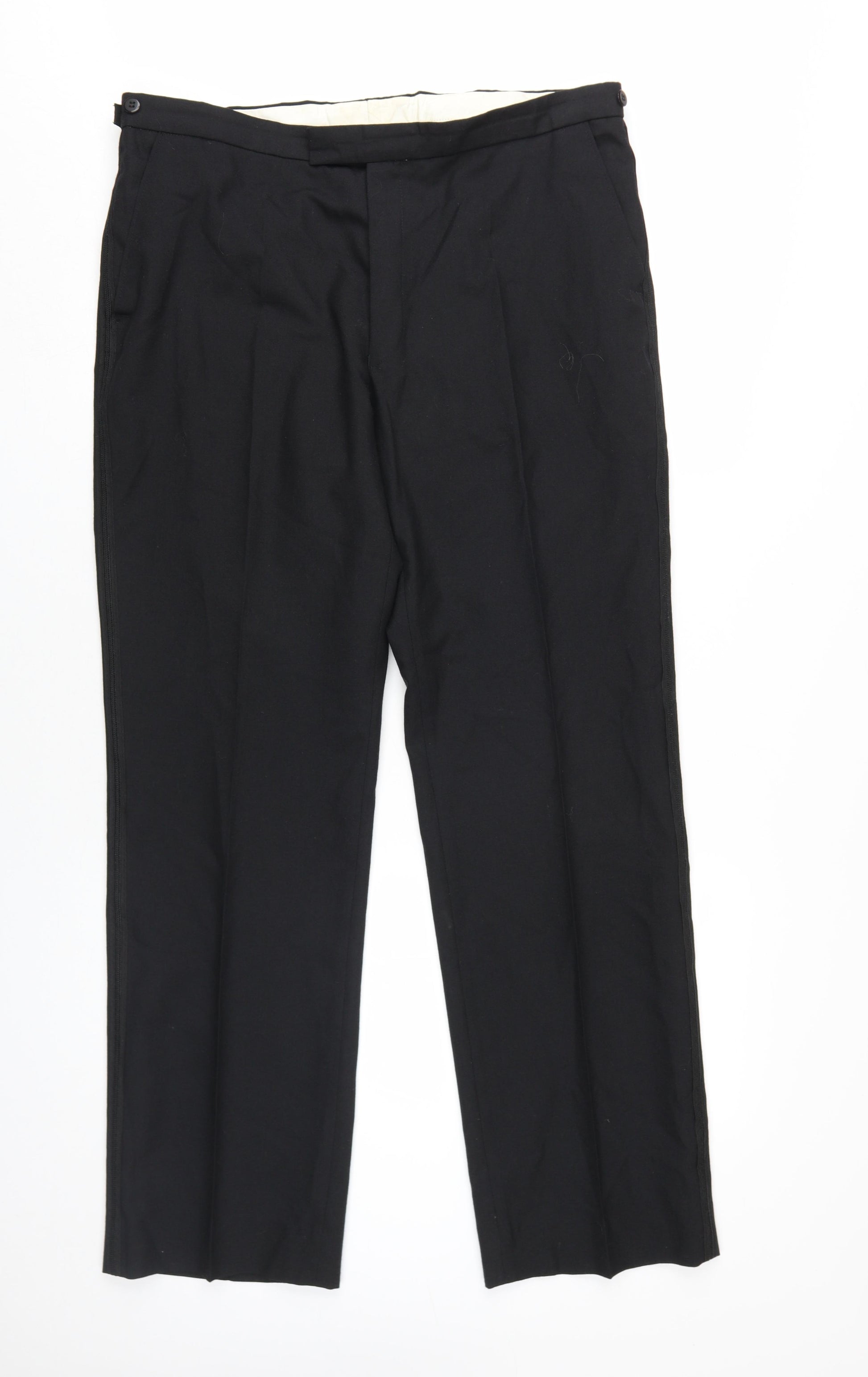Step into style with these classic black suit trousers from Dunn & Co, perfectly tailored for the modern gentleman. Constructed from a robust blend of 55% polyester and 45% wool, these trousers offer both resilience and comfort, making them ideal for any occasion. The straight leg design enhances the timeless appeal, while the pleated front adds a touch of sophistication. Featuring a roomy 38-inch waist and inside leg length of 31 inches, they offer an impeccable fit for a distinguished look. Though these trousers show minor wear, they are in excellent condition, promising durability and style. Ideal for business meetings or formal events, these trousers can effortlessly transition into smart-casual settings. Elevate your wardrobe with this versatile pair and experience the enduring quality of Dunn & Co.