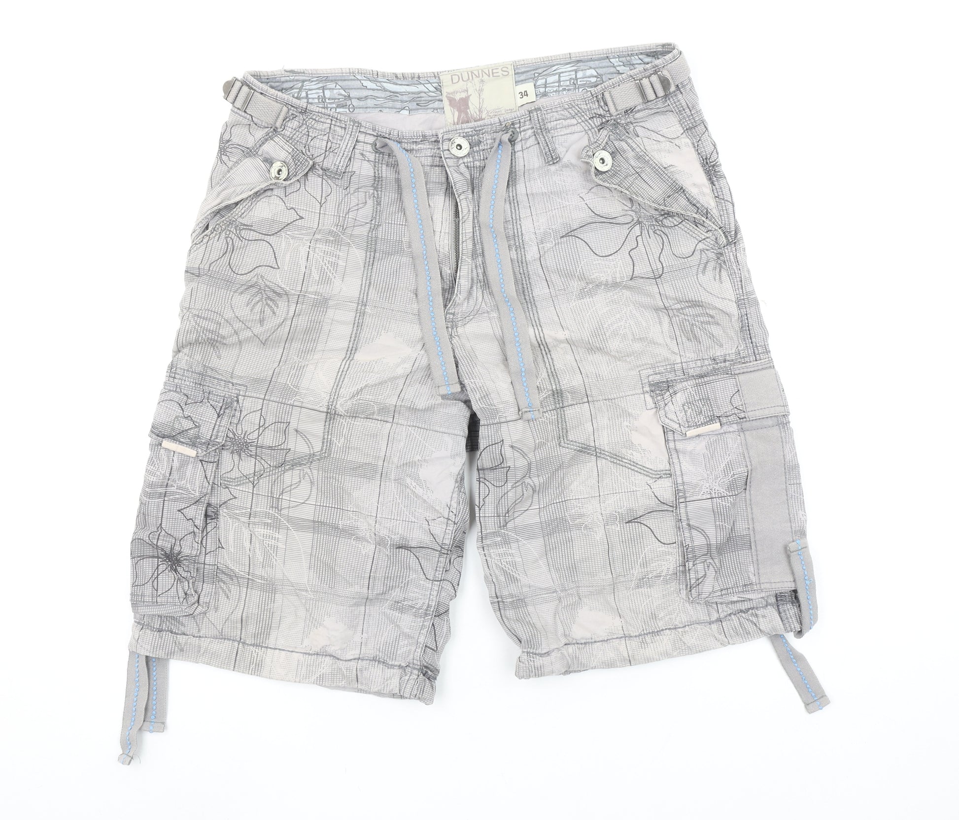 These Dunnes men’s grey cargo shorts combine casual style with practical comfort, making them an excellent choice for everyday wear and travel. Crafted from 100% cotton, the lightweight, breathable canvas fabric ensures comfort even in warmer weather. The light grey tone with a subtle floral and checked pattern adds unique character, offering a fashionable twist on a classic cargo design. Featuring multiple pockets including side cargo, front slash, and coin pockets, these shorts provide convenient storage for all your essentials. The front button and zip fastening is complemented by a drawstring waist, offering an adjustable fit for enhanced comfort. Reinforced with belt loops and finishing drawcords at the hems, they deliver both durability and versatility. Ideal for casual outings, holidays, or relaxed weekends, these shorts have a regular fit and mid-length design, giving a comfortable and contemporary silhouette. Their natural cotton material makes them easy to care for, as they are machine washable and designed for long-lasting wear. The light fabric wash enhances their summery vibe, making them a fantastic addition to any laid-back wardrobe. In very good pre-loved condition, they show light signs of wear but no visible flaws, reflecting gentle use and careful maintenance. Perfect for pairing with t-shirts, polos, or casual shirts, they transition seamlessly between leisure and travel wear. With a waist size of 34 inches, these shorts suit a regular build, ensuring ease of movement without compromising style. Whether heading to the beach, exploring the outdoors, or simply relaxing on a warm day, the Dunnes grey cargo shorts deliver comfort, practicality, and casual appeal. Their timeless design and functional features make them a reliable wardrobe staple for every warm season.