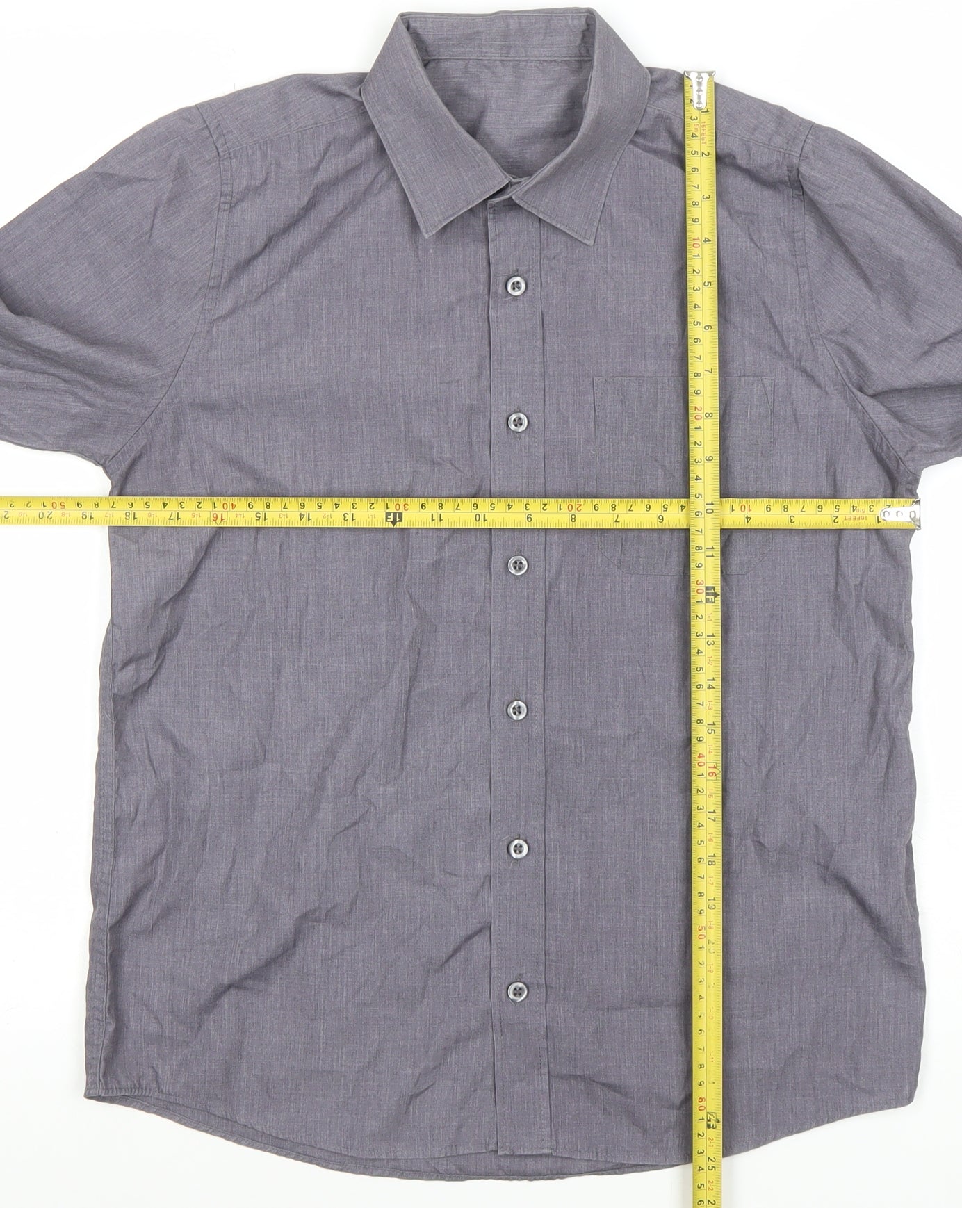 Give your young gentleman’s wardrobe an upgrade with this classic DUNNES STORES boys' grey button-up shirt in size 13-14 years. Crafted from a comfortable and durable blend of 65% polyester and 35% cotton, this shirt is designed for all-day wear, balancing breathability and easy care. The lightweight woven fabric gives a smooth finish with a smart matte sheen, perfect for both everyday wear and more polished occasions. This versatile shirt features a traditional point collar, a neatly buttoned front, and a single chest pocket for subtle detail. Its regular fit provides comfort without losing the structured look, making it a reliable option for school events, family gatherings, or casual days out. The long sleeves with buttoned cuffs allow for flexibility, rolled up for a relaxed look or worn down for a more formal feel. The medium grey colour makes it effortlessly pairable with chinos, jeans or dress trousers, allowing a variety of styling possibilities.Machine washable for convenience, this shirt retains its shape and colour with proper care, while its quality stitching ensures durability season after season. Though the item does not include original retail tags, it remains in very good pre-owned condition with no marks, holes, or pulls visible—simply lightly creased from storage. Suitable for spring, summer, and autumn wear, this Dunnes Stores shirt is an affordable yet stylish staple for your child’s wardrobe.A dependable choice for both comfort and smart style, this button-up shirt from a trusted high-street brand delivers excellent value for quality. Priced fairly based on comparable pre-owned listings, it’s an ideal option for parents looking for style and practicality combined in one timeless piece.