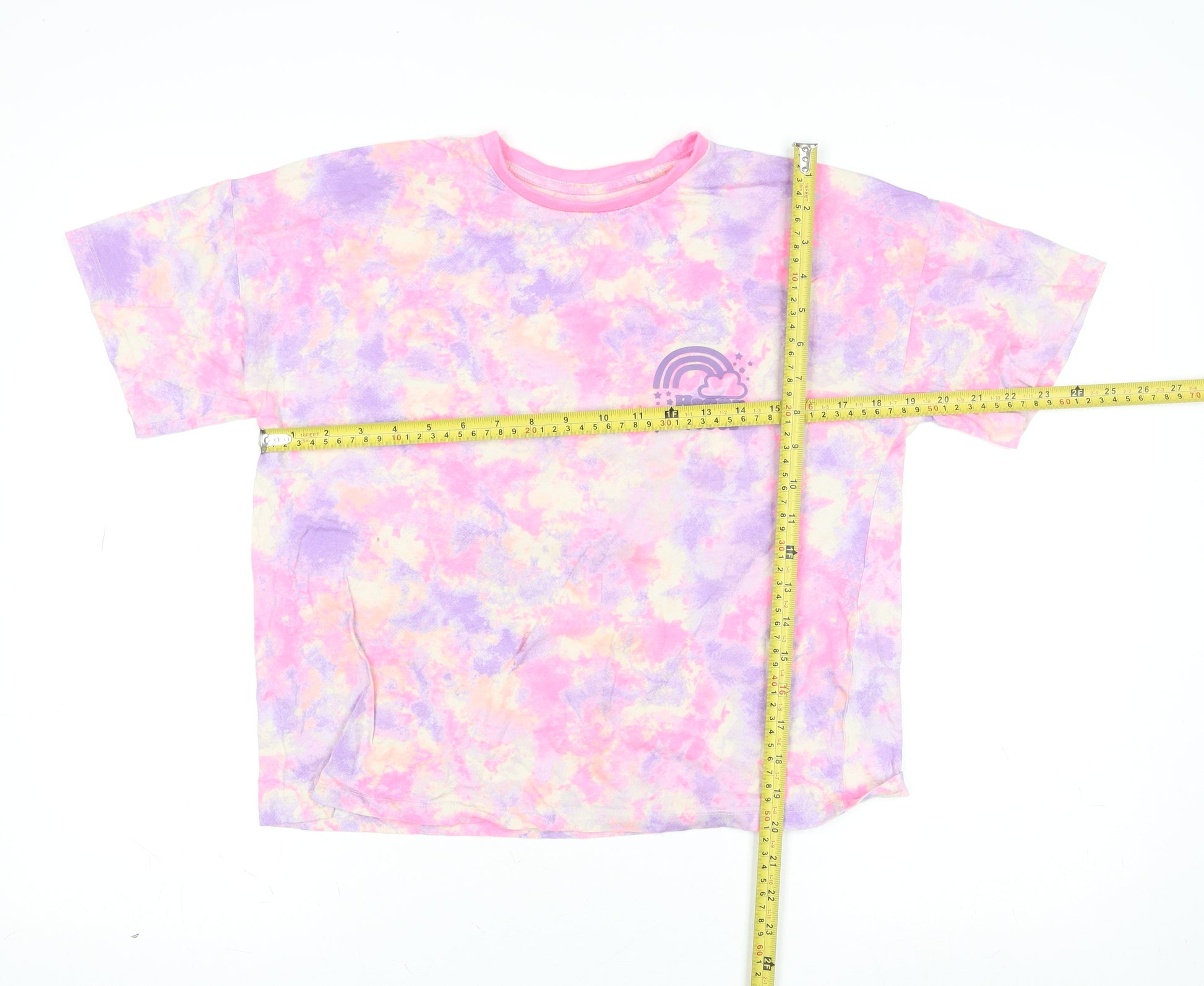 Bring a burst of cheer to your little one’s wardrobe with this vibrant multicoloured tie dye T-shirt from Dunnes Stores. Designed to celebrate fun and positivity, the tee showcases a lively pink, purple, and yellow swirl pattern with a charming 'Happy Vibes' rainbow graphic on the chest. The comfortable crew neck and classic short sleeves make it perfect for everyday wear, while the soft 100% cotton fabric ensures breathability and comfort throughout warmer days. Ideal for casual outings, playdates, or simply adding a colourful twist to weekend wear, this top pairs effortlessly with jeans, shorts, or leggings. It offers a regular fit that allows easy movement, making it both stylish and practical for active kids. Machine washable for convenience, this lightweight and durable top effortlessly combines playful patterns with lasting wearability. With its happy rainbow motif and pastel-inspired colours, this piece is perfect for girls who love expressing their personality through vibrant fashion. Whether worn alone during summer sunshine or layered under a cosy hoodie in transitional seasons, this T-shirt is a versatile addition to any young wardrobe. In excellent pre-loved condition, it shows very little previous use but maintains a bright and fresh look. The Dunnes Stores quality ensures strong stitching and colourfast fabric that holds up beautifully after washes. A wonderful gift or wardrobe staple, this T-shirt captures the essence of carefree, positive style – perfect for inspiring smiles and joy wherever she goes. A must-have item for any young girl who loves colour, comfort, and happy vibes.
