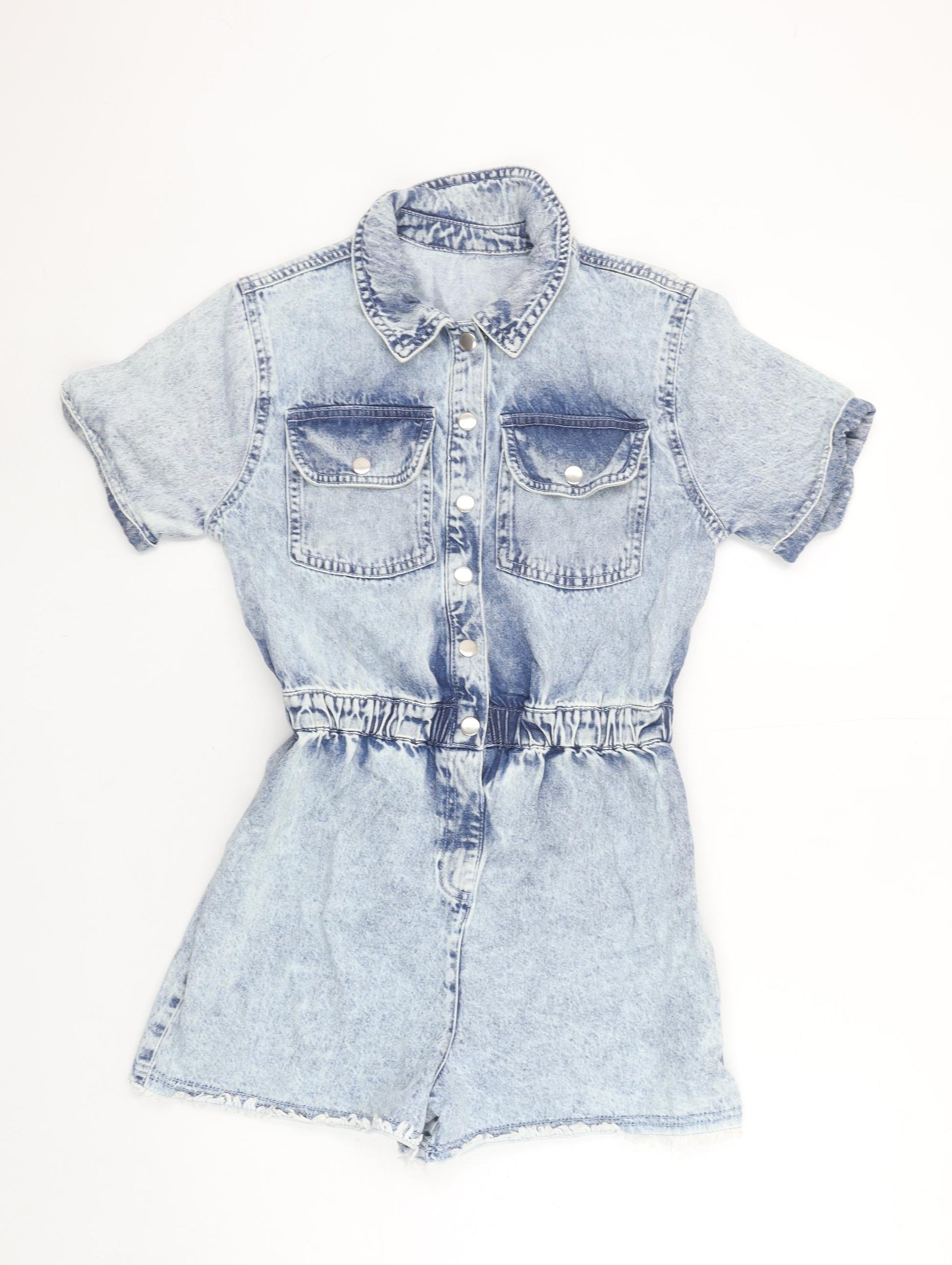 Refresh your casual collection with this stylish blue denim jumpsuit from Dunnes Stores. Crafted entirely from 100% cotton, this soft, breathable one-piece offers a relaxed yet flattering fit ideal for warm-weather outings. Designed in a light acid-wash finish, it features short sleeves, a collared neckline, and practical button-down front closure for effortless wear. The waist is gently elasticated, creating a tailored silhouette that enhances comfort and style. Two flap chest pockets with snap buttons add a touch of utility flair, while the short leg design with raw hems gives the look a modern, laid-back edge. Perfect for everyday wear, holidays, or casual meetups, this playsuit brings a touch of retro charm to your wardrobe while keeping you cool and comfortable. Style it with trainers for a relaxed day look or pair it with wedges and accessories for a chic summer outfit. Made to last, this piece combines durability and timeless style, ideal for denim lovers looking for an effortlessly wearable staple.