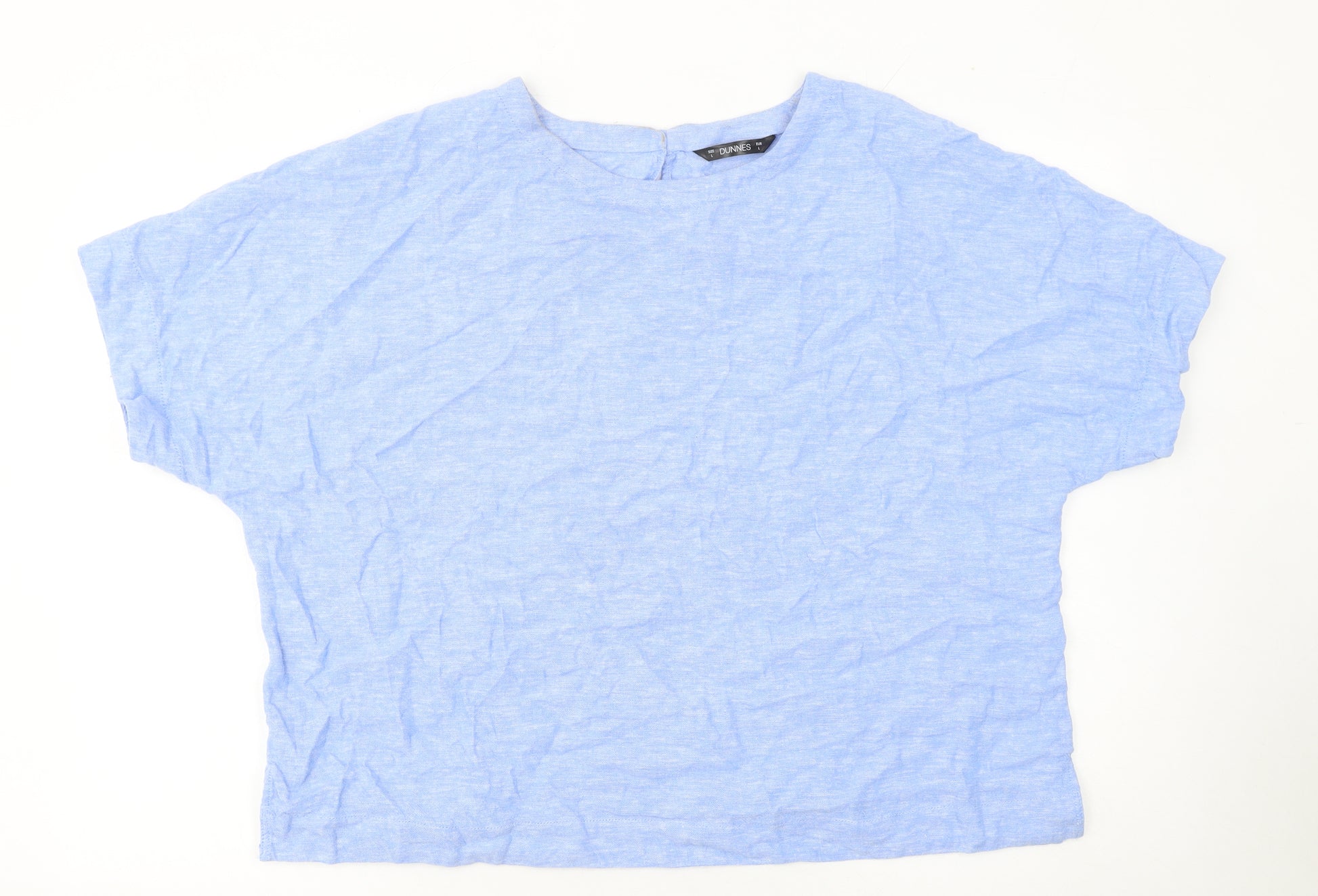Refresh your wardrobe with this breezy blue blouse from Dunnes Stores, crafted from a quality linen-viscose blend for a lightweight and breathable feel. Perfect for warmer days, this relaxed-fit top combines simplicity and comfort with effortless style. The soft woven fabric in a pastel blue shade makes it ideal for pairing with jeans, trousers, or skirts for both casual outings and smart-casual occasions. Featuring a simple round neckline, short dolman sleeves, and a small button fastening at the back, it offers a clean, modern silhouette with a touch of feminine charm. The natural linen fibres lend a slightly textured appearance, while the viscose content helps to maintain a smooth drape and softer feel against the skin. Designed in a versatile size 16, this blouse flatters a range of body shapes and can be dressed up or down depending on the occasion. Whether styled with tailored shorts for a day out or layered under a blazer for a more polished look, it maintains its easy-care practicality with machine washable convenience. Its understated elegance makes it a wardrobe staple for spring and summer, keeping you cool and chic wherever your day takes you. Though gently pre-owned, this garment remains in very good condition with only light creasing from storage, ready to wear and enjoy. A reliable, breathable, and versatile blouse that bridges timeless design with everyday comfort. Ideal for anyone seeking a simple, high-quality piece that delivers both durability and understated style.