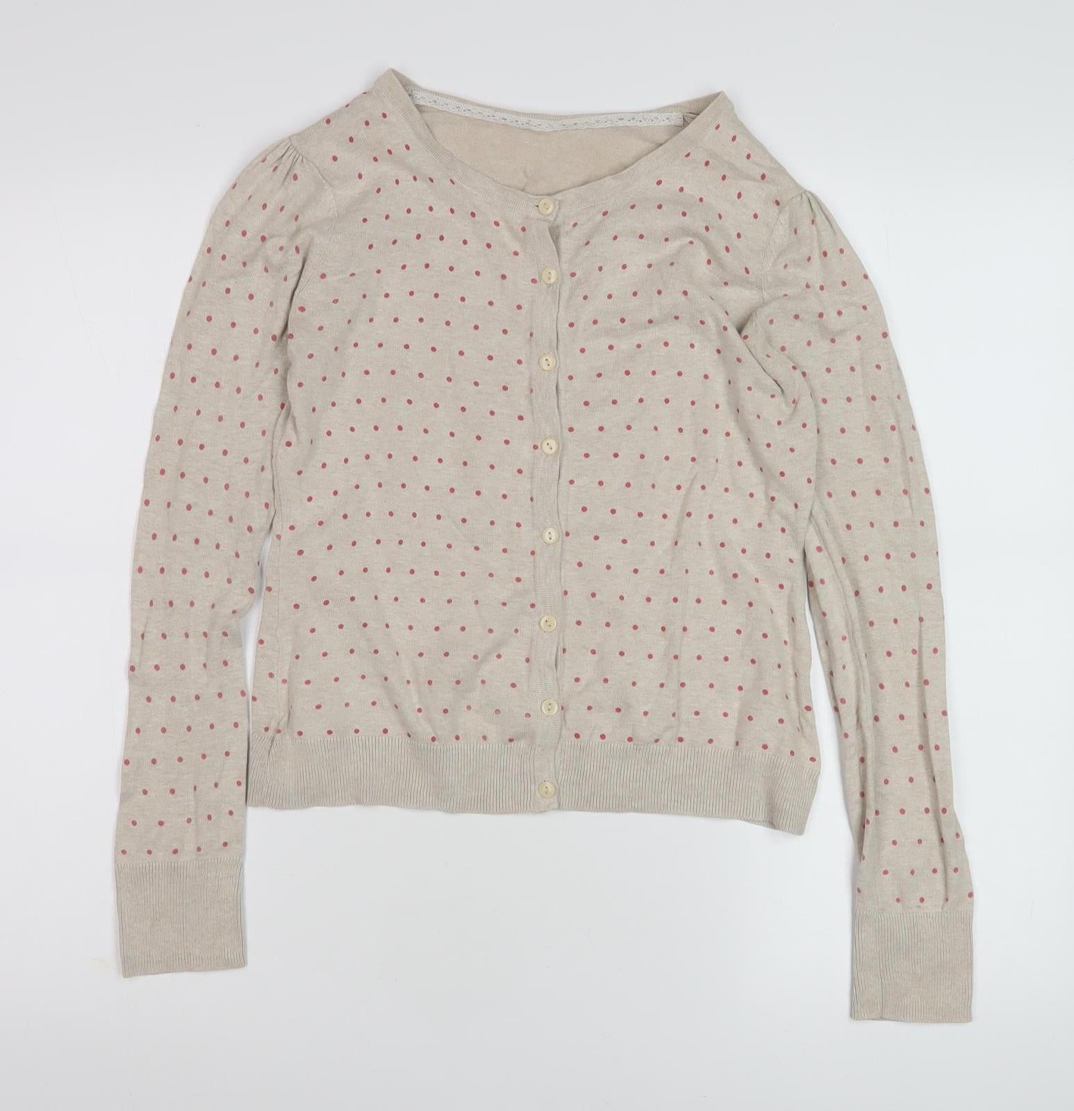 Step out in style with this charming women's beige polka dot cardigan from Dunnes Stores, perfect for adding a touch of playful elegance to any outfit. Crafted from soft knit cotton, this piece is designed for both comfort and style, making it an ideal choice for casual outings. Its size 14 fit is tailored for regular size types, ensuring a flattering silhouette. The long sleeves and button accents add classic detailing to this cardigan, while the polka dot pattern offers a sweet nod to retro aesthetics. Although in very good condition, there is a minor mark on the back, which adds a touch of character and uniqueness to the piece. Pair it with your favourite jeans or a skirt for a versatile addition to your wardrobe. Embrace the effortless charm of this cardigan and bring a delightful touch to your everyday look.