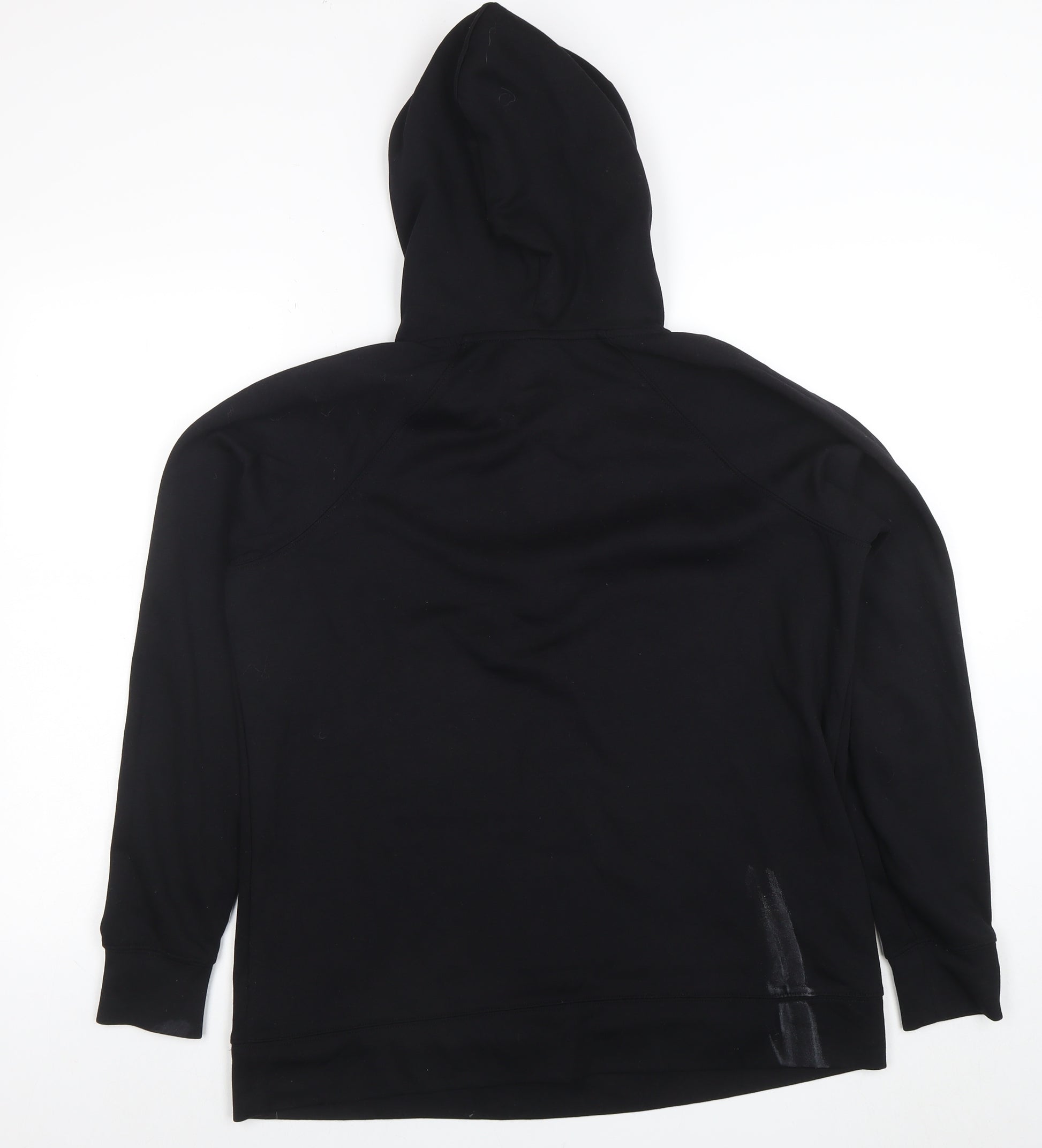This women’s black hoodie from Dunnes Stores offers a perfect combination of everyday comfort and effortless style. Crafted from a soft and durable blend of polyester, viscose, and elastane, it provides a smooth, breathable feel while maintaining its flattering shape. The material blend ensures flexibility and comfort, making it ideal for casual wear, layering, or light workouts. Designed in a pullover style with a practical 1/4 zip closure, it allows for easy wear and temperature control. The hoodie features a spacious front kangaroo pocket—convenient for keeping hands warm or carrying small essentials on the go. The attached hood adds extra warmth and coverage, while the long raglan sleeves enhance mobility and provide a relaxed silhouette. Its sleek plain black colour contributes to a minimalist, versatile look that pairs effortlessly with jeans, leggings, or joggers, making it suitable for the gym, casual outings, or travel days. The regular fit ensures flattering comfort for everyday wear across seasons. Though lightly used, this hoodie remains in very good condition with only a small mark near the hem that does not detract from its overall quality. Perfect for anyone seeking an affordable, stylish, and practical layering option, this Dunnes Stores hoodie transitions seamlessly from activewear to loungewear, offering both value and reliability. Ideal for autumn, winter, and spring wear, it’s a low-maintenance piece that’s easy to wash and perfect for life on the move.