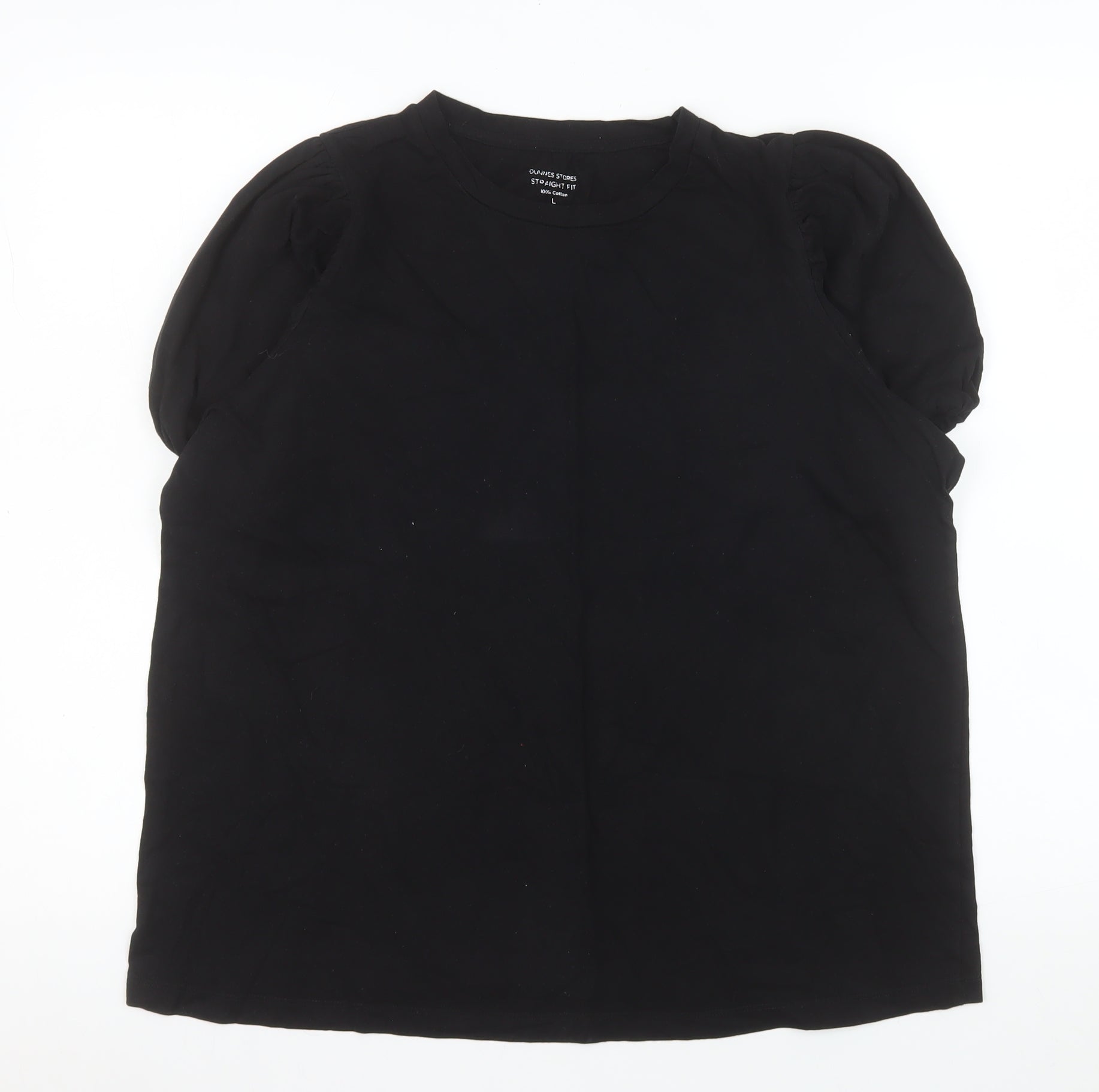 This stylish women's black T-shirt from Dunnes Stores offers a classic yet modern feel, perfect for everyday wear. Crafted from 100% cotton, it ensures softness and breathability, making it ideal for comfort throughout the day. The fabric is a jersey knit, providing a gentle stretch and a flattering drape that suits a wide range of body shapes. Designed with a straight fit, this piece delivers a balanced silhouette that sits comfortably across the shoulders and torso. The short puff sleeves add a feminine touch, giving the T-shirt a subtle statement look while maintaining its versatile and minimalist appeal. The crew neckline provides a timeless cut that complements both casual and dressed-up outfits. This T-shirt is perfect for layering under blazers, cardigans, or wearing alone on warmer days. Its solid black colour makes it a wardrobe essential, easily paired with jeans, trousers, or skirts for a range of occasions—from casual weekends to relaxed workwear. Designed for women who value simplicity and comfort, this top's breathable, lightweight cotton fabric ensures it feels equally at home during spring and summer or layered beneath outerwear in cooler months. Machine washable for easy care, it remains a durable and practical garment that retains its shape and colour. In excellent condition with minimal signs of previous wear, this Dunnes Stores T-shirt combines quality construction with understated elegance, offering timeless wearability. A staple item that belongs in every wardrobe, blending casual sophistication with everyday comfort. An ideal choice for those who appreciate an effortless, clean look. Get this versatile black puff sleeve T-shirt today and enjoy a reliable go-to piece for any season and occasion.