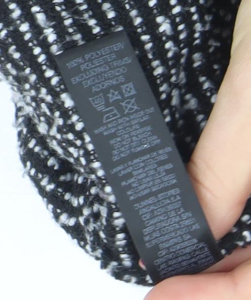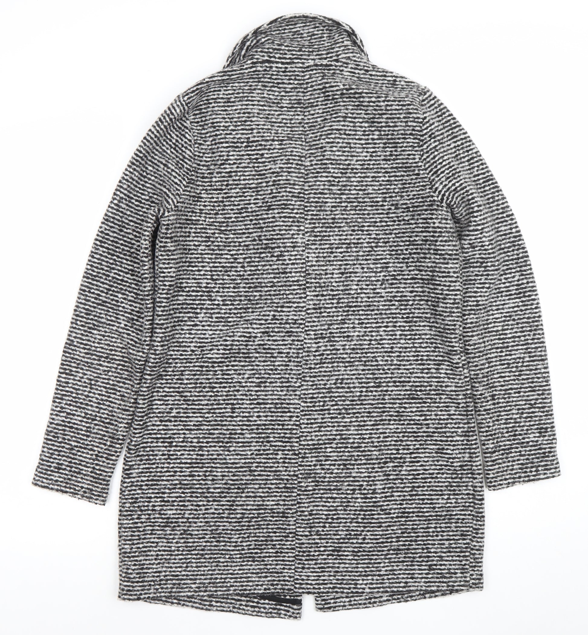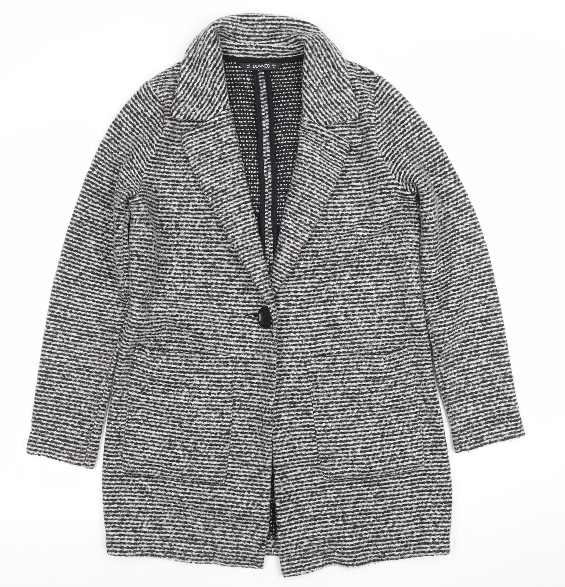 Stay effortlessly chic and cosy with this beautiful women's black and white striped coatigan from Dunnes Stores. Crafted in a soft and warm wool blend fabric featuring 65% acrylic, 30% polyester, and 5% wool, this piece combines both comfort and style perfectly. Designed in a mid-length cut that offers flattering coverage and ease of movement, it’s an ideal layering piece for both casual and smart occasions. The coatigan’s regular fit ensures a relaxed yet polished silhouette, complete with a classic single-breasted front that fastens neatly with a single button. The lapel collar adds structure and refinement, while two front patch pockets introduce a practical and laid-back finish. The black and white stripe knit pattern gives the piece an eye-catching texture that pairs easily with almost any outfit, from jeans and boots to tailored trousers for workwear chic. The coatigan is machine washable, making it easy to care for and maintain, while the knitted fabric provides warmth for autumn and winter seasons without the bulk of a heavy overcoat. This is a versatile wardrobe staple perfect for transitional weather and can elevate your outfit whether you're heading to the office, out shopping, or meeting friends for coffee. The coat is in excellent pre-loved condition, showing no visible signs of wear or damage. Perfect for those who appreciate timeless, functional outerwear with a fashionable twist. Add a touch of effortless elegance to your wardrobe with this Dunnes Stores wool blend black and white coatigan — where style meets everyday comfort for the modern woman.