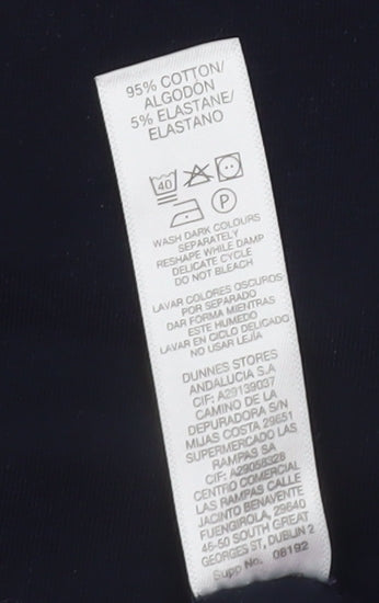 This Dunnes Stores women’s T-shirt in a deep navy blue hue is the ultimate wardrobe staple for effortless style and comfort. Crafted from a premium cotton and elastane blend, the soft jersey fabric provides a breathable and lightweight feel while ensuring just the right amount of stretch for a flattering and comfortable fit. Designed in a classic crew neckline with short sleeves and a regular, easy-to-wear silhouette, this Essential Tee works perfectly for layering or as a standalone piece throughout spring, summer, and autumn. The cotton-rich material makes it soft against the skin, while the elastane enhances flexibility, ensuring freedom of movement for everyday wear. With its solid colour and minimalist design, this versatile top easily pairs with jeans, shorts, or skirts for casual days, or can be tucked into trousers for a neat, smart-casual look. Practical features include machine washability and quick drying, ideal for those who prefer fuss-free garment care. Although showing a small mark on the front, this pre-loved top remains in very good overall condition with no major flaws or visible wear. The understated styling allows it to transition seamlessly from day to evening, making it a practical choice for anyone seeking a reliable, timeless wardrobe essential. Whether you’re heading out for errands, meeting friends, or relaxing at home, this stretchy and breathable Dunnes Stores women’s cotton T-shirt offers comfort and classic appeal in one. Available in UK size 14 (EUR 40–42), it’s designed for a regular fit, ensuring a flattering cut that complements a range of body types. A simple staple that never goes out of style, this piece embodies relaxed chic and easy versatility.