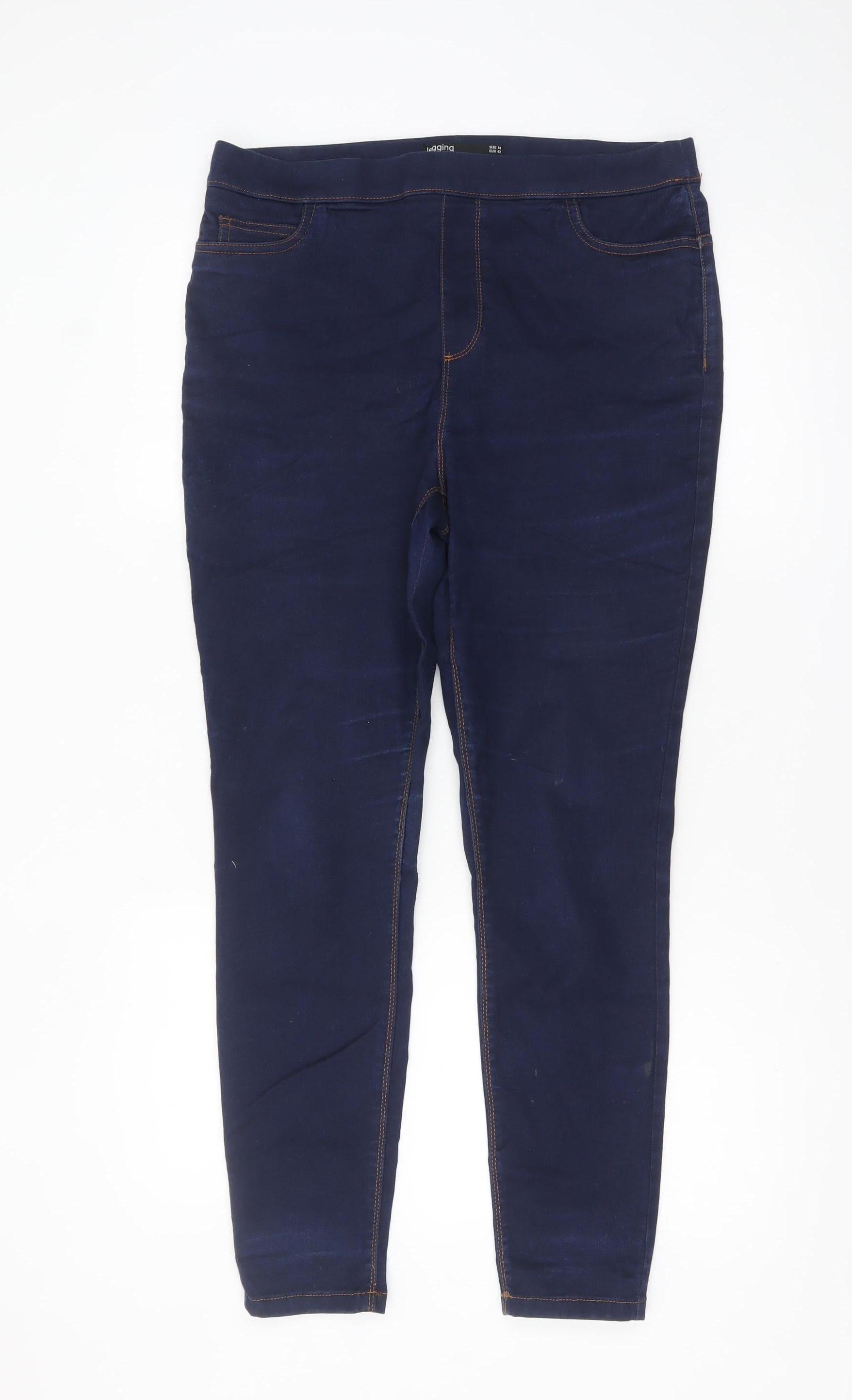 These Dunnes Stores women’s blue jegging jeans offer the perfect balance of comfort and modern style. Designed in a flattering size 14 fit, they feature a slim silhouette that hugs the figure while allowing plenty of stretch for easy movement. The rich indigo blue shade makes them versatile enough for layering with smart blouses or casual tops, while the contrast stitching detail adds a subtle hint of definition to the classic denim look. The soft, stretchy denim fabric — made from a blend of cotton, polyester and elastane — ensures these jeggings hold their shape throughout the day, offering reliable comfort and durability. Styled with a smooth elastic waistband, they are easy to pull on and off and provide a sleek, smooth front without the bulk of traditional zips or buttons. Practical pockets at the back add a functional touch, enhancing the everyday wearability. The mid-rise fit sits comfortably at the waist, complementing a wide range of body types and making them ideal to pair with tunic tops, shirts, or chunky knitwear through the cooler months. These jeggings are machine washable and designed for easy care, perfect for effortless upkeep. In excellent pre-owned condition with no visible damage or faults, they remain a high-quality, wardrobe-staple piece. Great for autumn, winter, or spring wear, they deliver a timeless, modern style you can rely on for casual days, errands, or relaxed evenings out. A dependable and stylish choice for the woman who values both comfort and fashion.