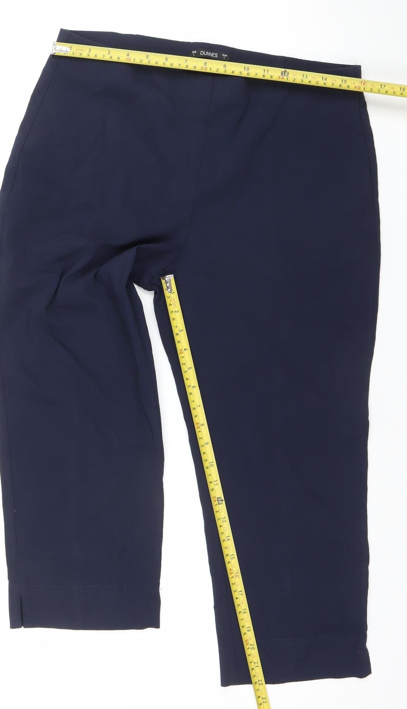 Elevate your everyday wardrobe with these elegant blue trousers from Dunnes, crafted to deliver both comfort and a modern silhouette. Designed for women who appreciate a sleek and streamlined fit, these trousers feature a slim leg cut that flatters the natural shape of your body while allowing for easy movement throughout the day. The soft stretch fabric blend of polyester and elastane ensures long-lasting wear and flexibility, making them ideal for all-day comfort whether at work or on the go.Rendered in a versatile deep blue shade, they can be seamlessly styled for both professional and casual occasions. The elastic waistband adds to their comfort, providing a smooth fit without bulk. Their minimalist design with a flat front and clean lines makes them a polished choice for a smart-casual look. Pair them with a blouse and blazer for workwear elegance, or keep it relaxed with a T-shirt and trainers for a chic weekend ensemble.Perfect for the warmer months, these trousers are lightweight and breathable, making them suitable for spring and summer seasons. Their fabric composition resists wrinkles and keeps its shape, ensuring they stay looking neat throughout the day. The casual sophistication of these Dunnes trousers makes them a versatile wardrobe staple that transitions easily between settings.With an excellent pre-owned condition, these trousers show minimal signs of wear — just light creasing consistent with gentle use. Offering great value for quality and style, they’re an affordable yet stylish addition to your fashion rotation. Whether you're heading into the office, running errands, or enjoying a casual lunch with friends, these trousers strike the perfect balance between comfort and polish.Invest in timeless simplicity and practicality with Dunnes women’s blue stretch trousers — dependable, flattering, and designed for modern-day ease.