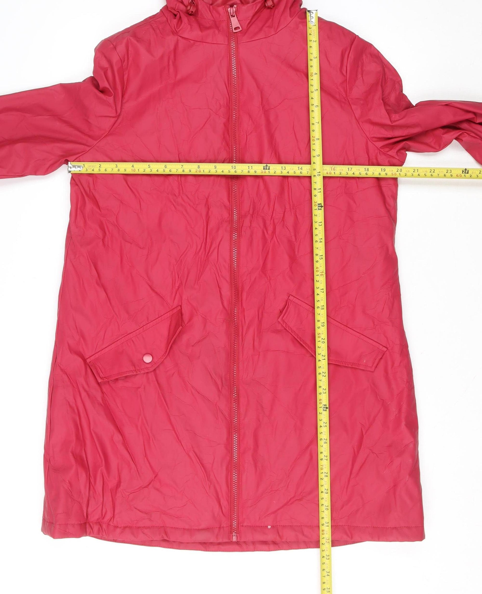 Stay stylish and dry whatever the weather with this Dunnes women’s red hooded rain coat jacket in size 12. Crafted entirely from polyester for a lightweight yet durable outer shell, it provides reliable water resistance while maintaining comfort and practicality. The full zip fastening keeps it easy to wear, while the hood ensures extra protection against unexpected showers. Featuring two front flap pockets with snap closures, this jacket combines functionality with a sleek, modern aesthetic. The mid-length cut offers versatile coverage, perfect for layering over casual outfits or travel attire. The clean, minimal design gives the coat a timeless look suitable for both everyday errands and weekend adventures. Its smooth polyester lining ensures comfort, while the shell remains breathable and easy to care for with simple machine wash maintenance. Ideal for spring and autumn seasons, this rain coat is a practical addition to any wardrobe where lightweight weather protection is essential. The vibrant red tone adds a pop of colour to brighten up grey days, while the regular fit allows comfortable ease of movement without bulk. With its understated style and smart details, this Dunnes jacket offers reliable quality and versatile appeal. Whether heading out for a walk, commuting, or travelling, it's designed to keep you comfortable and effortlessly put-together. Condition-wise, the coat remains in excellent pre-loved state, showing only minimal signs of wear. A clear choice for those who appreciate quality and value, this water-resistant jacket balances practicality with everyday chic, reflecting the effortless design aesthetic Dunnes is known for. Add this wardrobe essential and enjoy a flattering, functional outer layer ideal for transitional weather.