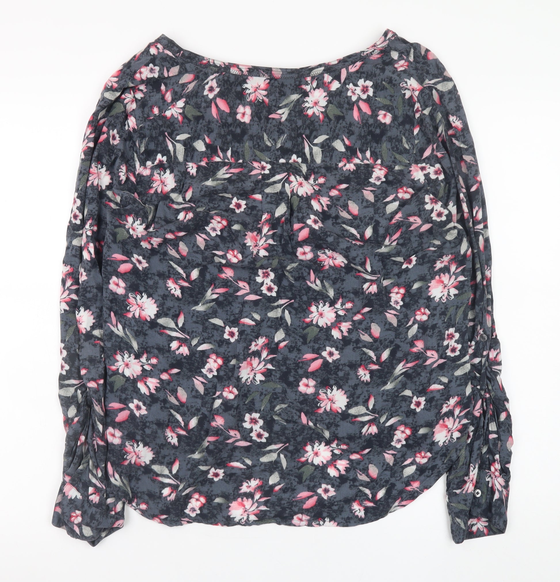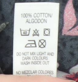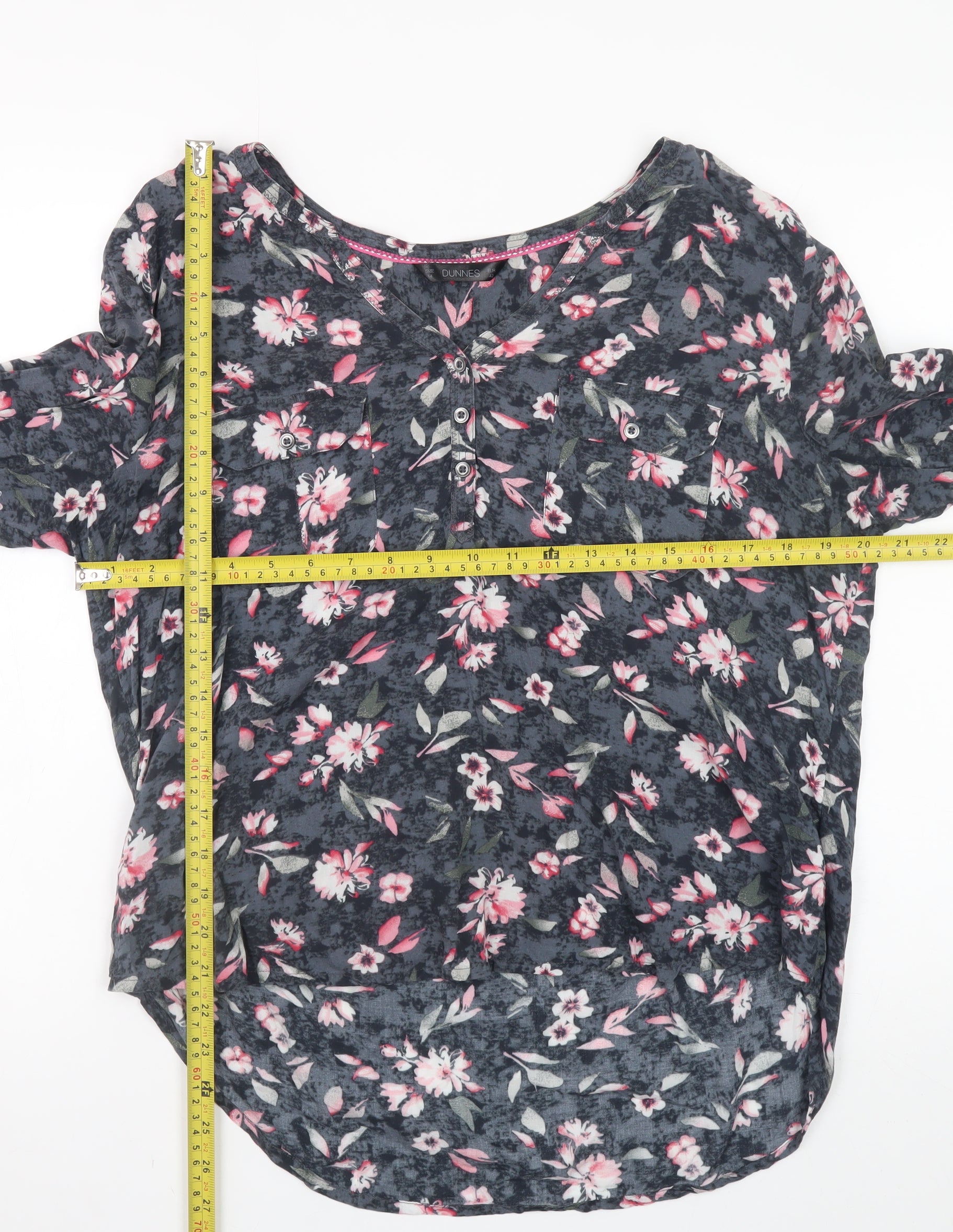 Step into effortless feminine style with this beautiful Dunnes Women’s Multicoloured Floral Tunic Blouse in size 14. Crafted from 100% cotton, the blouse offers a breathable and soft feel that ensures comfort throughout the day. The relaxed, lightweight fit makes it a versatile piece perfect for spring and summer, whether you're dressing for a casual outing, a weekend lunch, or layering for the office. The dark background, adorned with vibrant pink, grey, and white floral prints, brings a striking yet subtle look that flatters every figure. Designed with long sleeves and fitted cuffs, the top features a scoop neckline and a partial button fastening for simple elegance and everyday ease. Its woven cotton fabric provides durability and a natural drape, while the gentle silhouette creates a flattering, easy-going feel that embodies both comfort and style. This blouse’s lively print and breathable nature make it ideal for pairing with jeans, tailored trousers, or skirts, offering plenty of outfit possibilities across multiple occasions. Whether styled with sandals for a fresh daytime look or under a light jacket for cooler evenings, the Dunnes floral blouse is an essential addition to any wardrobe. In excellent pre-owned condition, this quality piece shows minimal signs of wear and retains its pristine look and feel. Perfect for those who value timeless style, comfort, and durability at an affordable price, this blouse will quickly become a reliable favourite. Machine washable for easy care, it blends practicality with an elegant everyday appeal. Choose this lovely cotton floral tunic blouse to refresh your collection with a touch of charm and versatility that suits every season.