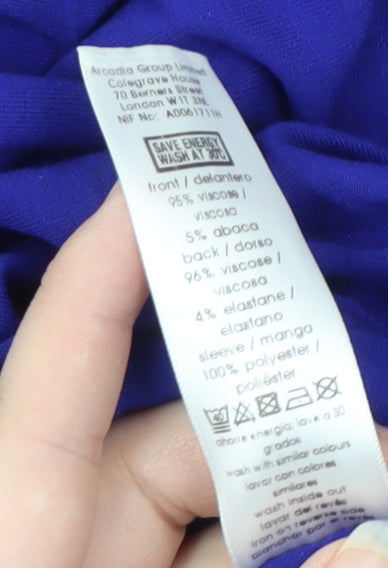 This stylish women's blouse features a vibrant blue hue with an eye-catching animal print pattern, perfect for adding a splash of colour to your wardrobe. Crafted from a blend of viscose, elastane, and polyester, it offers a comfortable fit with long sleeves and a round neckline. Though showing signs of wear with some stains, it's a great addition for casual outings or social gatherings, providing both comfort and style.