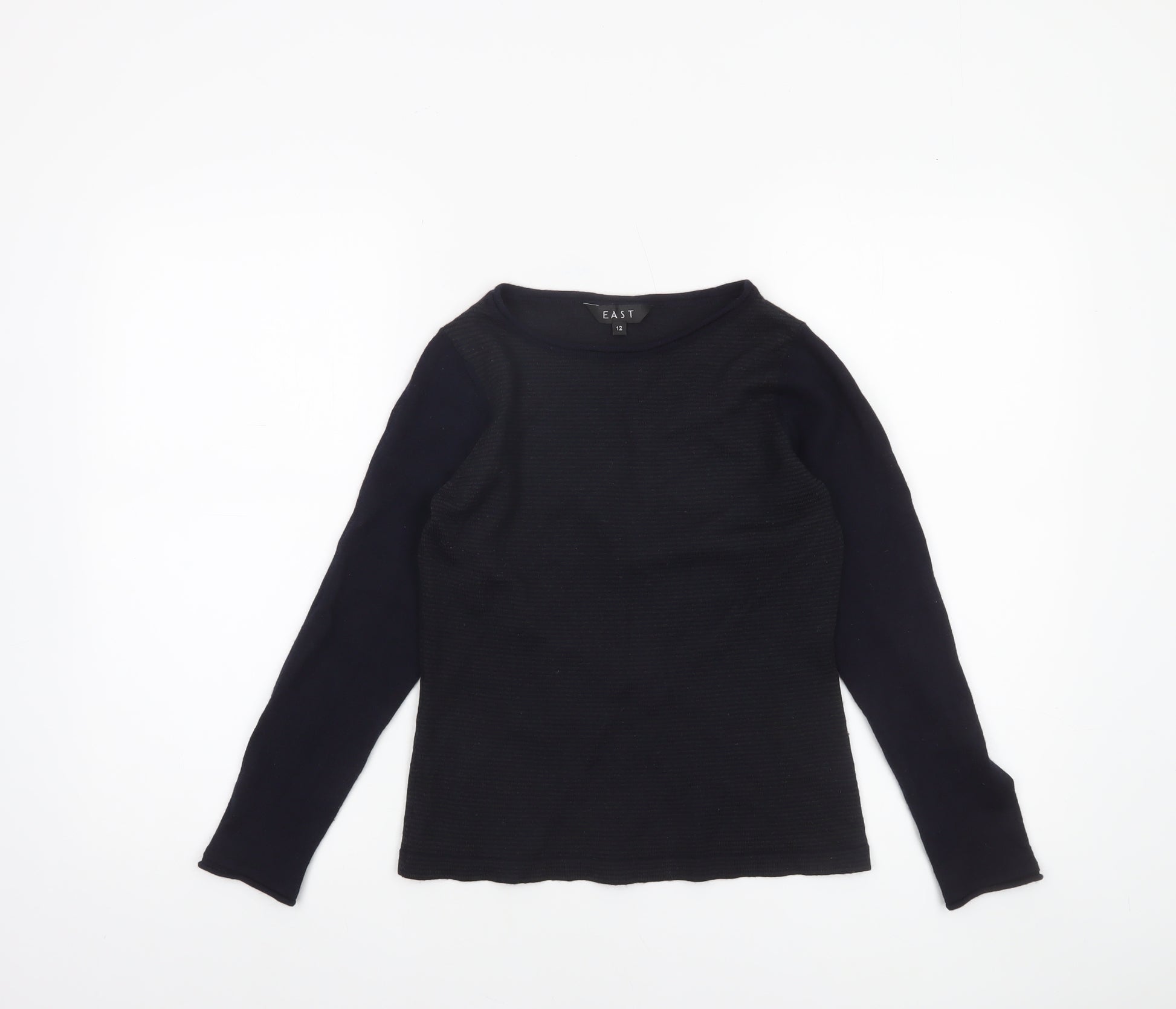 Effortlessly refined and timelessly designed, this EAST womens black pullover jumper offers a perfect blend of warmth, comfort, and understated sophistication. Crafted in a luxurious wool blend fabric combining 50% wool and 50% acrylic, this piece provides both softness and durability. It’s a lightweight knit ideal for layering through autumn and winter, keeping you warm without compromising on style. The sleek crew neck design gives it a clean, modern profile, while the long sleeves and refined knit texture lend a touch of elegance suitable for both workwear and leisure. Its deep black hue offers endless versatility — pair it with tailored trousers for an office-ready ensemble or layer over a collared blouse for timeless weekend style. The regular fit ensures a flattering silhouette for everyday wear. The fabric’s tight-knit structure enhances comfort and gives it a smooth, premium finish that drapes naturally over the body. Designed for women who appreciate quality and simplicity, this classic jumper is perfect for season-spanning wardrobe rotation.EAST is renowned for its commitment to superior craftsmanship and attention to detail, and this jumper exemplifies those values beautifully. While gently pre-owned, it remains in excellent condition with no visible signs of wear or damage, ensuring plenty of life and style left to enjoy. Whether you’re dressing for a smart-casual occasion, layering up for crisp winter mornings, or simply want a comfortable yet polished pullover, this EAST knitwear piece will quickly become a key part of your go-to collection. A staple in versatile British style, it’s the kind of jumper that pairs seamlessly with jeans, skirts, or slacks — a must-have addition for any wardrobe that values both comfort and quality.