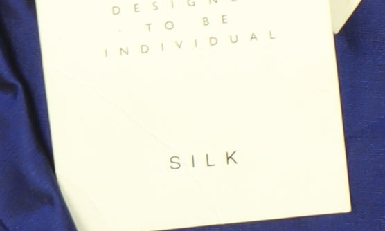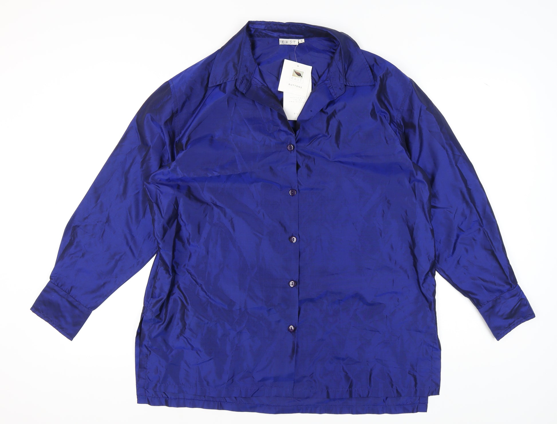 Embrace elegance and timeless style with this exquisite blue silk button-up shirt by East. Crafted from 100% luxurious silk, this piece boasts a beautiful sheen and smooth texture that immediately elevates any outfit. The rich blue hue adds a touch of sophistication and pairs seamlessly with both formal and casual attire.With its classic collared neckline and long fitted sleeves, this shirt offers a flattering silhouette that complements various body types. The button-up design allows for versatile styling options, perfect for layering under blazers for a professional look or wearing on its own for a more relaxed, chic appearance.Designed for the modern woman, this shirt ensures you stand out with its quality craftsmanship and attention to detail. Suitable for many occasions, it effortlessly transitions from the office to dinner outings or special events. Its solid pattern makes it a versatile wardrobe staple, while the new condition with tags ensures you're receiving a pristine garment.Experience the unparalleled comfort and style of real silk with this remarkable piece. Ideal for those who appreciate fine materials and classic designs, this shirt is a valuable addition to any wardrobe. Don't miss the opportunity to enhance your collection with this stunning garment from East.