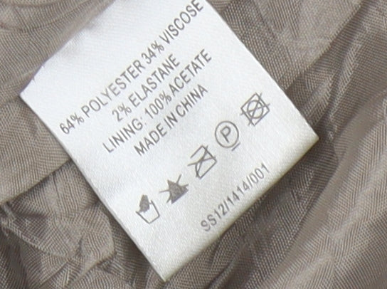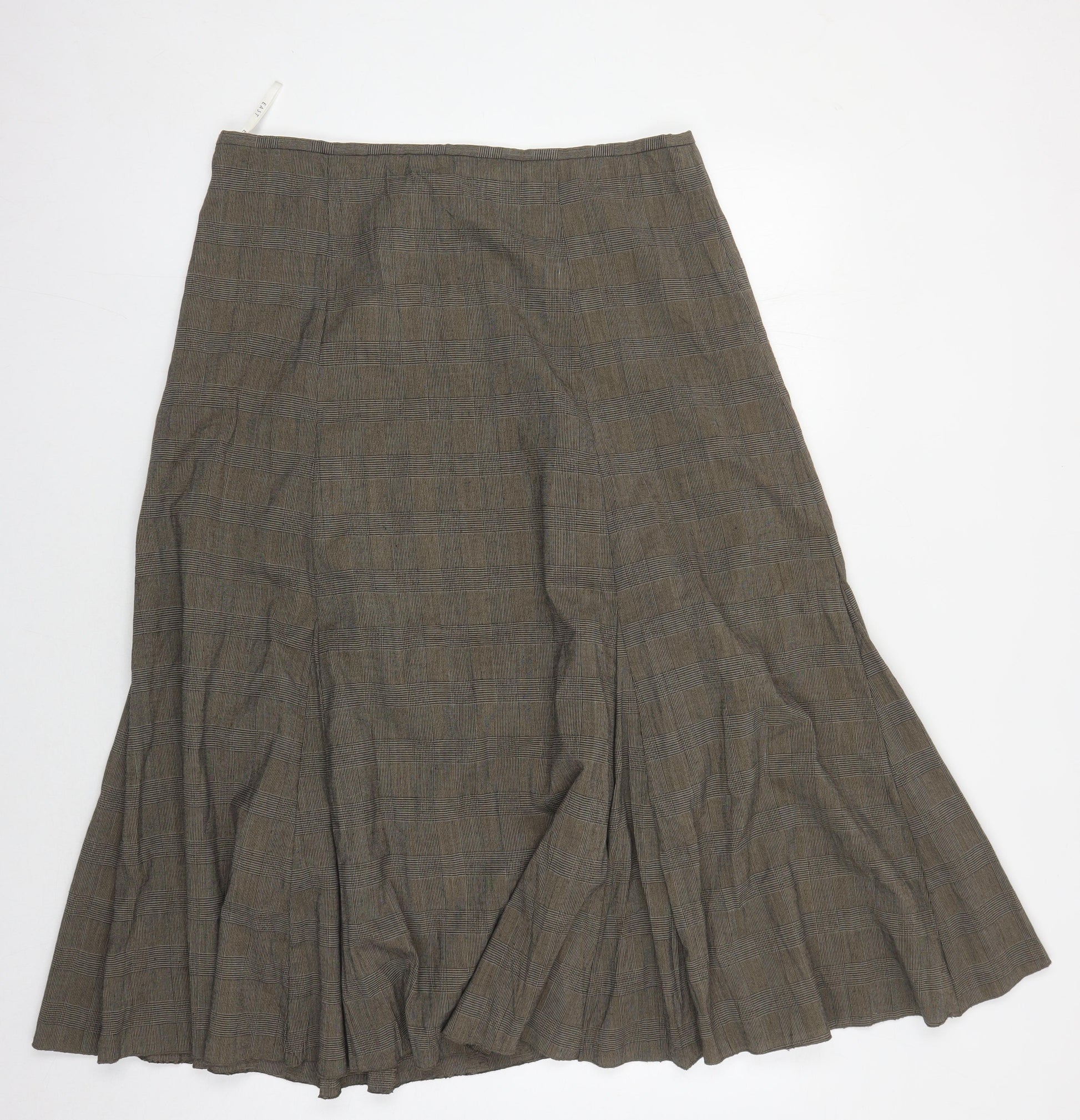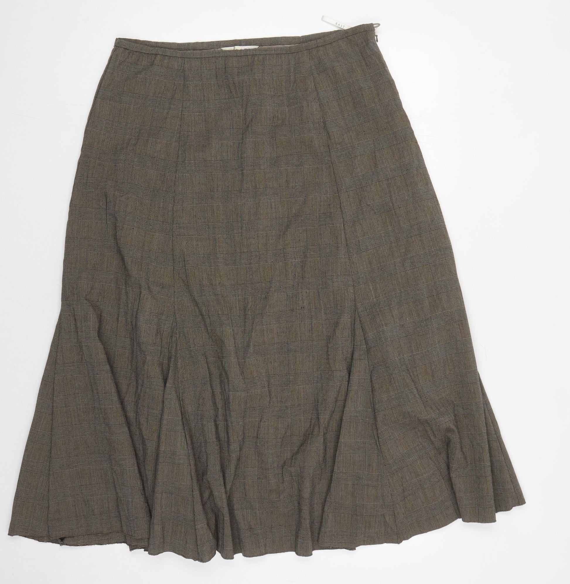Elevate your wardrobe with this stylish East skirt, perfect for women who appreciate classic flair. This brown check patterned skirt presents a timeless piece that can seamlessly integrate into your work or casual attire. Designed in a flattering flared style, it effortlessly enhances your silhouette. Crafted from a blend of 64% polyester, 34% viscose, and 2% elastane, this skirt offers both comfort and durability. Ideal for various occasions, whether it's a day at the office or a casual outing, this skirt promises versatility and elegance. With a convenient zip closure and a mid-rise waist, it ensures a comfortable fit. Despite being pre-loved, the skirt is in excellent condition, evident by its pristine appearance. Pair it with a fitted blouse and heels for a sophisticated look or a casual top and flats for everyday wear. This versatile piece is machine washable for effortless care, making it a practical addition to any wardrobe. Don't miss out on this charming skirt that's bound to become a staple in your collection.