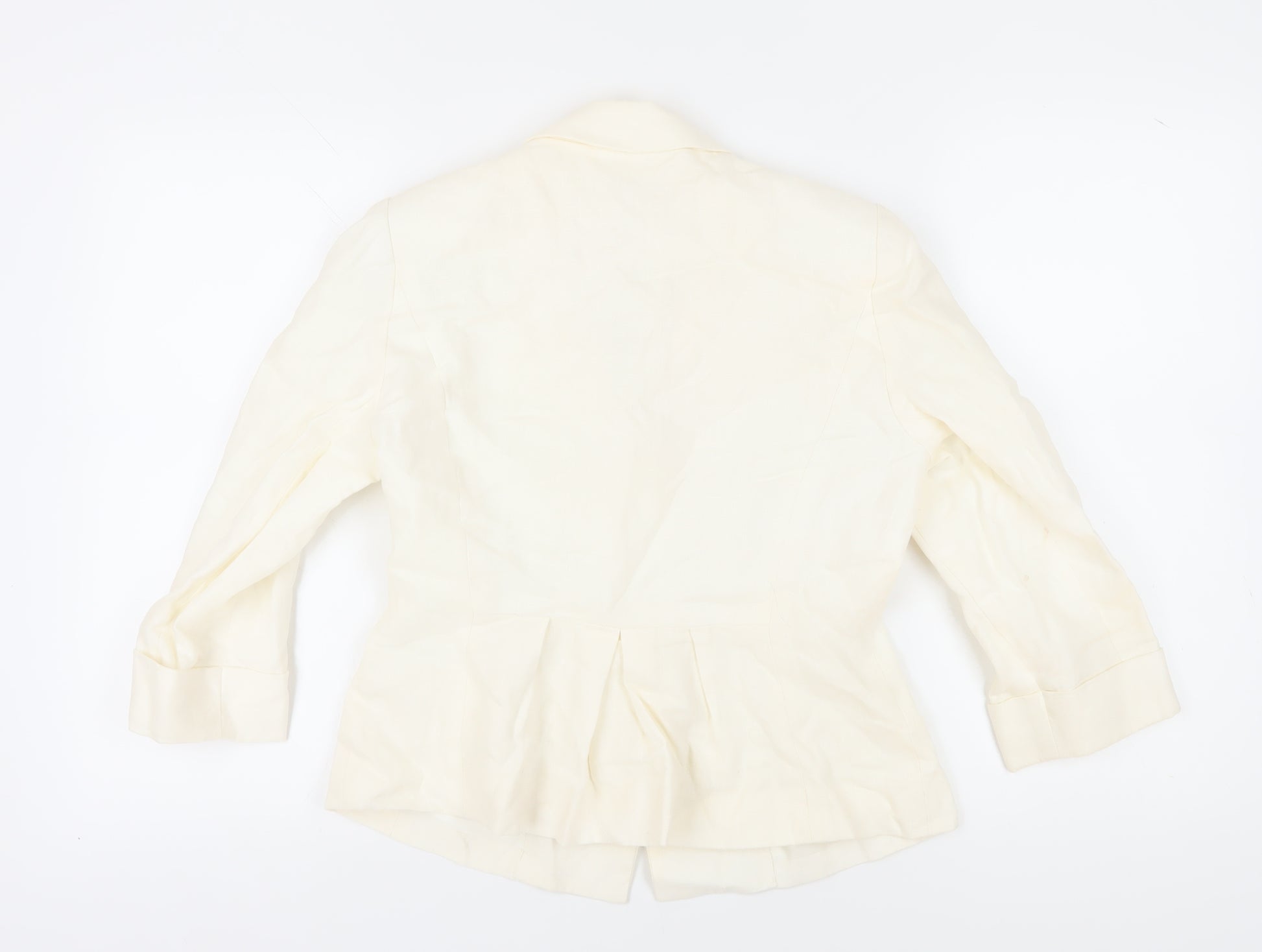 Discover effortless elegance with this ivory linen blazer by East. A perfect choice for both business and casual settings, this blazer offers a timeless design crafted from 100% linen, making it ideal for the spring and summer seasons. Its regular fit, complemented by a three-button front, provides a comfortable yet sophisticated silhouette. The notched lapel adds a touch of classic style, while the 3/4 sleeves offer a modern twist, making it a versatile addition to your wardrobe. This single-breasted blazer is fully lined with acetate for added comfort. Though in very good condition, it has some small marks visible, reflective of a gently pre-loved item. Pair it with trousers or skirts for a polished office look, or dress it down with jeans for a relaxed weekend ensemble. This piece effortlessly embodies a blend of style, comfort, and functionality, ensuring you look and feel your best.