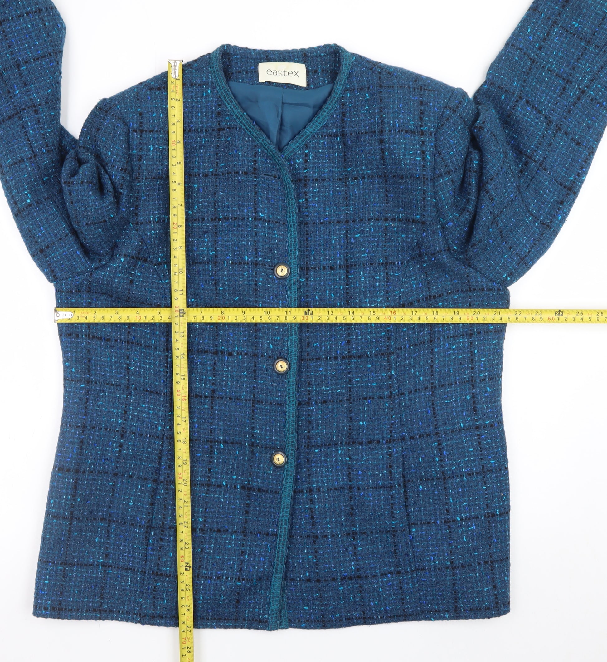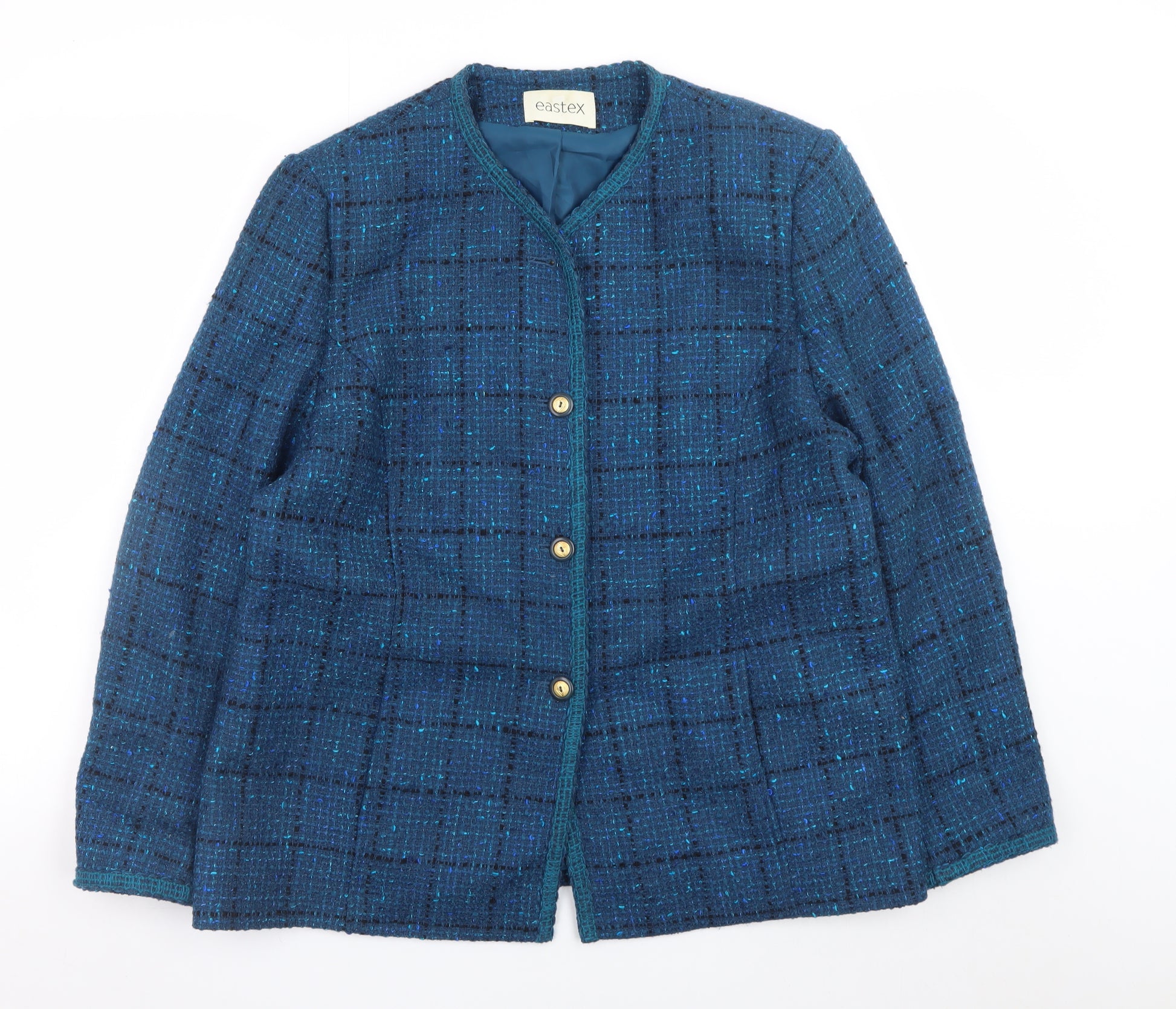 Elevate your wardrobe with this timeless and elegant Eastex women’s jacket, crafted from a rich wool blend for exceptional quality and comfort. Presented in a classic blue tweed design, this mid-length jacket showcases refined tailoring that effortlessly complements both smart and casual ensembles. Designed with a round neckline and detailed with gold-tone front buttons, it embodies understated sophistication typical of Eastex craftsmanship. The structured silhouette offers a flattering, regular fit, making it suitable for everyday wear or more polished occasions. Expertly made from 60% wool, 32% acrylic, and 8% polyamide, it delivers a soft yet resilient finish while maintaining warmth, ideal for autumn and winter months. The inner lining, made of 100% polyester, provides additional comfort and ensures the jacket drapes beautifully. The traditional check pattern enhances its timeless appeal, while the fully lined interior ensures durability and premium wearability. Whether worn with tailored trousers for a professional look or layered over a dress for a refined casual style, this jacket adapts seamlessly to a variety of looks. Its versatile design and classic shape make it a wardrobe staple that transcends seasonal trends. The quality craftsmanship and elegant blue tone capture the essence of refined British style, perfect for women who value both practicality and polished fashion. In excellent pre-owned condition with very minimal wear, this jacket offers the perfect opportunity to own a quality piece at a fantastic value. Don’t miss out on this sophisticated Eastex wool blend jacket—a great addition to any collection for those seeking classic style and comfort.