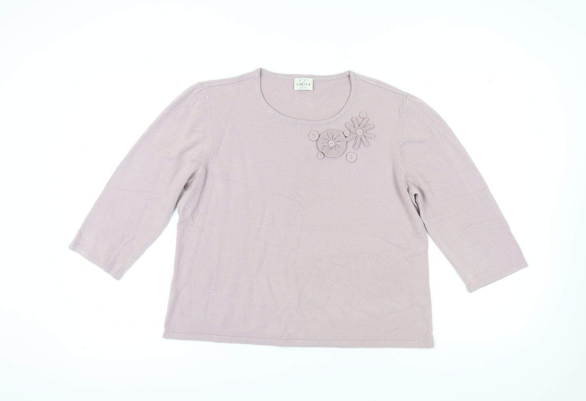 Introducing the Eastex Women’s Beige 3/4 Sleeve Pullover Jumper, a perfect blend of elegance and comfort that's ideal for any wardrobe. This jumper, crafted fully from soft acrylic, ensures a warm embrace during those chilly days while offering a chic style perfect for casual outings or a relaxed day at home. The classic beige hue complements a variety of colours, making it a versatile addition for layering or standalone wear. Featuring a round neckline, this jumper provides a simple yet sophisticated look that's enhanced with an embroidered accent near the neckline, adding a subtle touch of elegance. The 3/4 sleeves offer practicality and style, making it easy to layer under jackets or coats without the extra bulk. Despite being pre-loved, this garment is in very good condition, with a minor stain on the back which could potentially be removed with a gentle wash. The knit fabric promises durability and longevity, making it a lasting piece in any collection. Perfect for the woman on the go, this jumper is machine washable for easy care, ensuring it remains a staple in your wardrobe for many seasons. Pair it with jeans for a relaxed weekend look or wear it over a dress for added warmth in a chilly office. This versatile piece is designed for those who appreciate comfort without sacrificing style. Ideal for women who require larger sizes, this jumper is a UK 22, ensuring a perfect and flattering fit. Priced at £12.75, it’s a fantastic opportunity to add quality and style to your wardrobe without breaking the bank. Don't miss out on this beautiful Eastex pullover jumper that's as functional as it is fashionable.