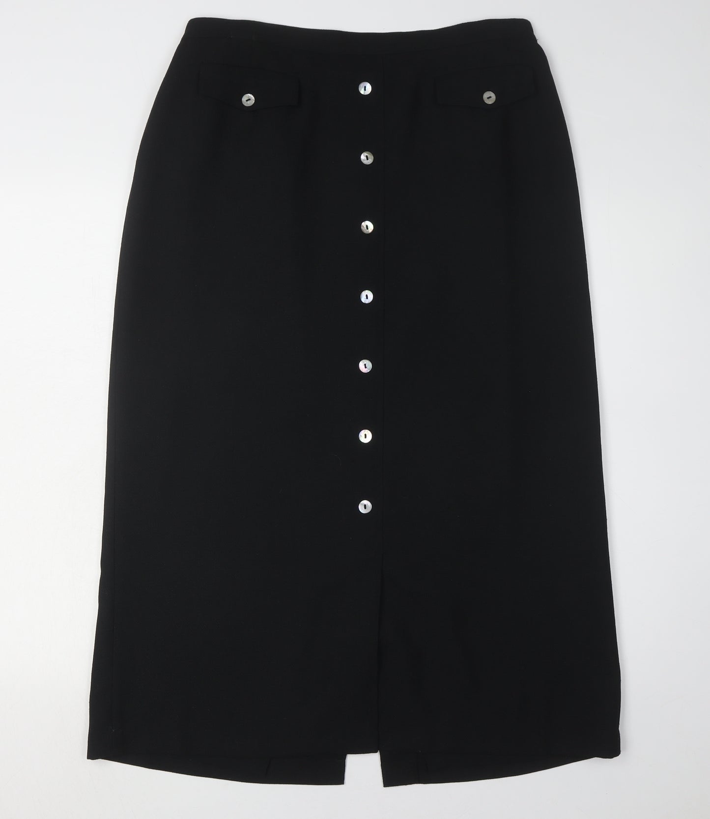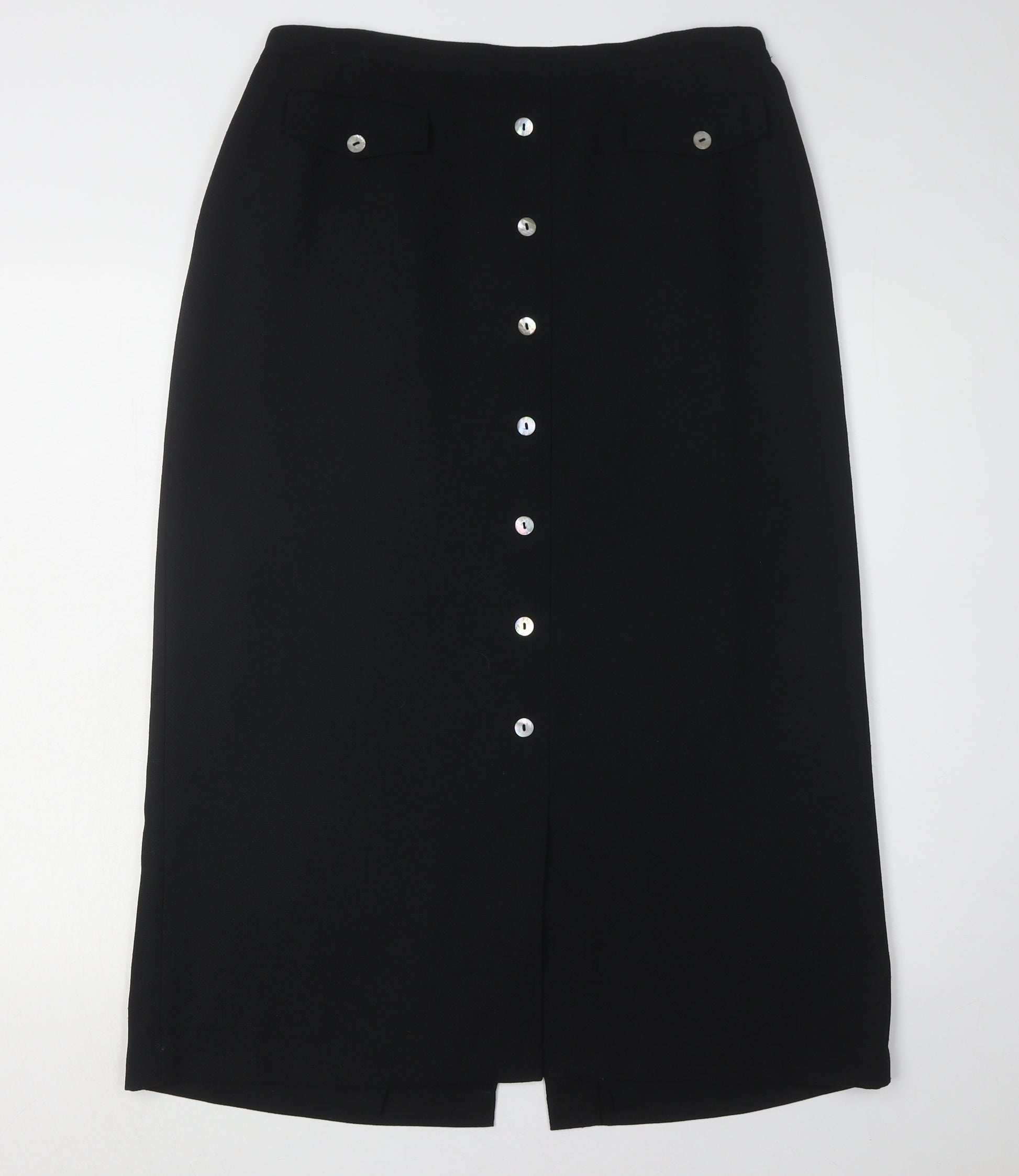 Elevate your wardrobe with this classic black pencil skirt from Eastex, tailored for the modern woman. This versatile piece in size 16 is perfect for both business and casual settings, offering a sleek and sophisticated silhouette. Crafted from quality polyester, it provides comfort and durability with every wear. The skirt features a mid-length for a flattering fit, lined for additional comfort, and adorned with a row of elegant buttons for a touch of class. Designed in a timeless straight and pencil style, it seamlessly fits within any fashion theme or occasion, whether at the office or at a casual gathering. The zip and button closure ensures a secure fit, while the hand wash garment care makes maintenance easy. Despite being pre-loved, it is in excellent condition, free from visible damage, making it a worthy addition to any fashion-forward collection. Embrace the minimalist design—ideal for pairing with your favourite tops and accessories. Shop now to enjoy this versatile skirt that brings elegance and practicality to your everyday style.