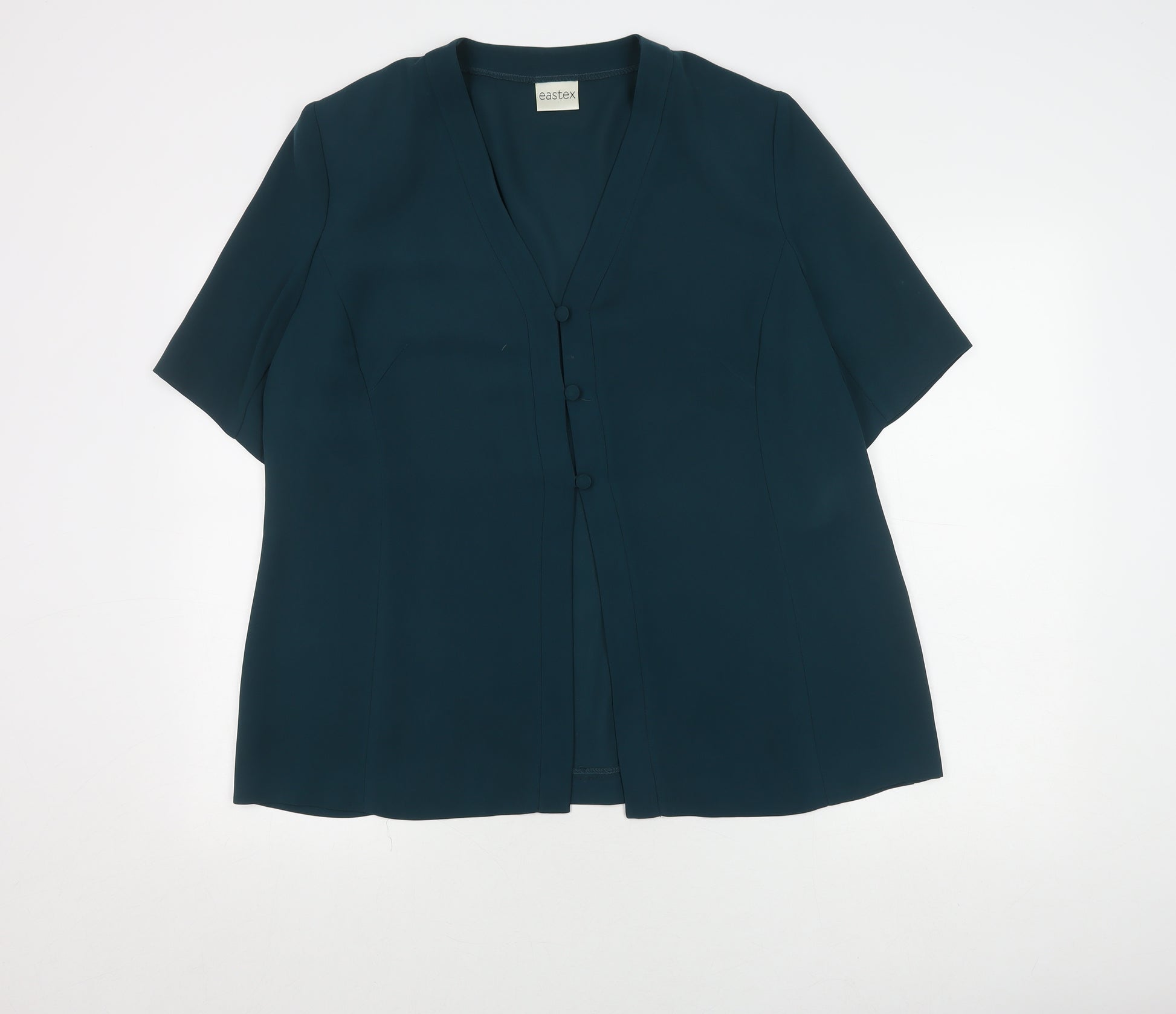 Elevate your casual wardrobe with this elegant Eastex women's blouse, beautifully crafted in a rich green hue. Designed for versatile style, this blouse features a classic yet contemporary V-neckline complemented by a solid, clean silhouette that suits any smart casual occasion. The short sleeves provide a neat and relaxed fit, perfect for layering or wearing alone during warmer seasons. Meticulously made from premium polyester, this blouse ensures durability and easy care, making it a practical addition to your everyday apparel collection. It offers a comfortable regular fit, catering specifically to women seeking both style and comfort. The blouse secures with stylish button accents, adding a tasteful touch of detail. Easy to maintain with its dry clean only fabric care option, this blouse remains in very good condition, showing only minor wear near the shoulders. Whether you’re dressing for a lunch out or a relaxed day at the office, this Eastex blouse is an essential wardrobe staple. Available in size 18, it is the ideal blend of simplicity and sophistication.
