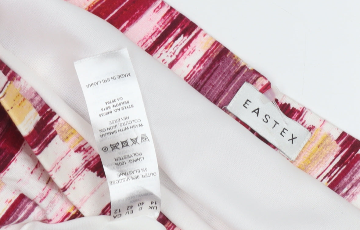 Discover elegance and sophistication with the Easttex Women's Multicoloured Geometric Pleated Skirt, perfect for elevating your wardrobe. Crafted with meticulous attention to detail, this skirt offers a luxurious feel with its smooth blend of 95% viscose and 5% elastane, ensuring both comfort and a flattering fit. The vibrant multicoloured geometric design makes a bold fashion statement, ideal for any woman seeking to add a splash of colour to her collection. Suitable for various occasions, this versatile skirt can easily transition from a casual day out to a chic evening gathering. The regular size 14 ensures a comfortable and true-to-size fit for women. Although this piece is in 'Excellent' pre-owned condition, you’ll find it remarkably maintained, devoid of visible signs of wear. Its pleated style contributes to an elegant silhouette, offering movement and grace with every step. Designed for those who appreciate colour and pattern, the geometric print is both modern and playful. This skirt embodies a contemporary style that complements various settings, from laid-back days at the office to weekend adventures. Fully machine washable, it combines fashion with practicality. Elevate your wardrobe with this stunning Easttex piece, a must-have for those who desire style and comfort in one appealing package.