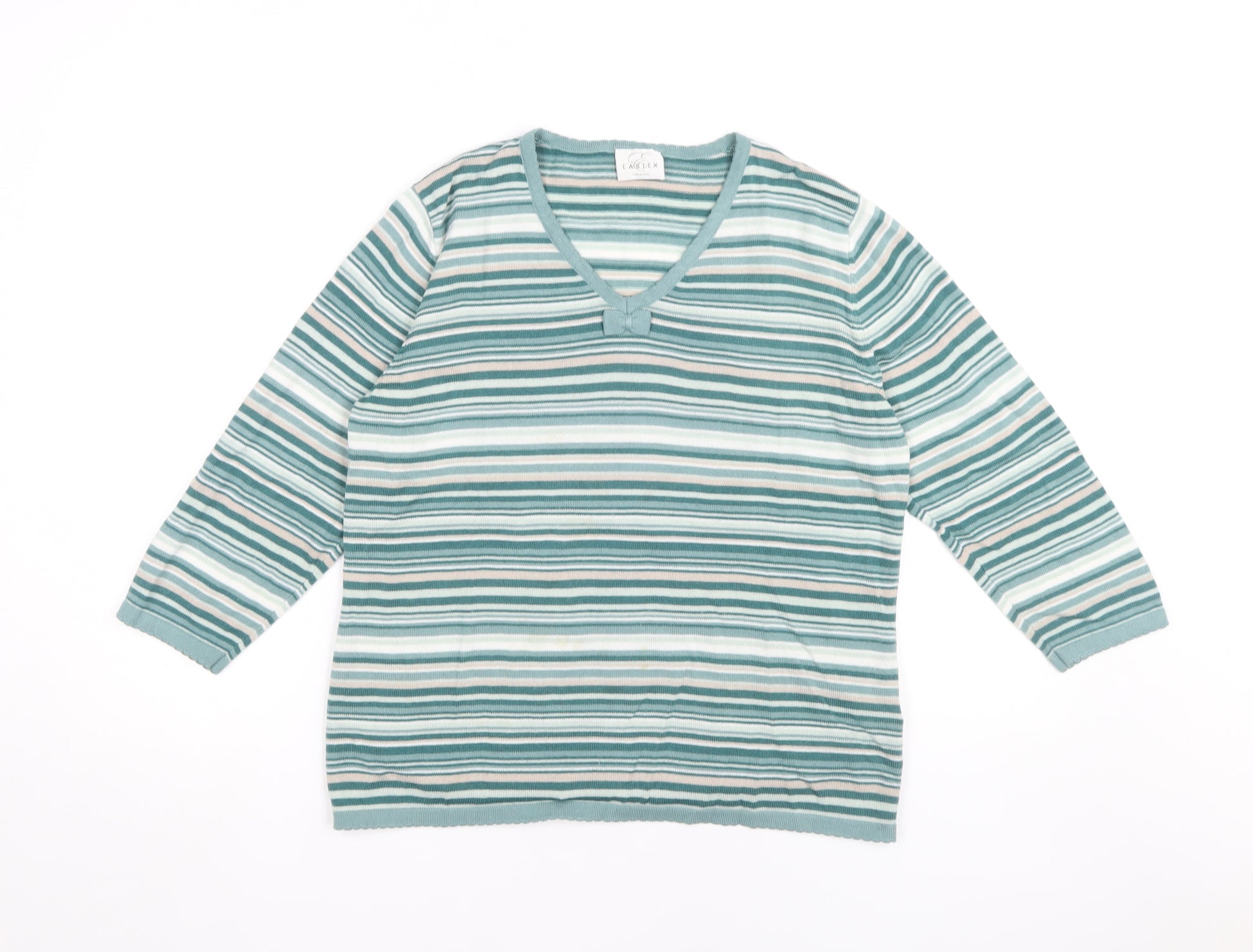 Elevate your casual wardrobe with this Eastex women's pullover jumper, designed to effortlessly blend comfort and style. Crafted from 100% cotton, this lightweight and breathable piece is perfect for any casual occasion throughout the year. The jumper features a timeless V-neckline and stylish 3/4 sleeves, providing a classic yet contemporary look. Its multicoloured striped pattern adds a playful touch, making it an ideal choice for casual outings or laid-back gatherings.The knit fabric type offers a snug yet comfortable fit, tailored for regular sizing to ensure ease of movement. Perfectly suitable for spring, summer, and autumn wear, this jumper exudes charm with its classic design elements. Although gently used, it remains in very good condition with only a small blemish on the front, ensuring you'll look your best while staying casual and cosy.This jumper carries the reliable Eastex brand, known for combining functionality with style, and adheres to a classic theme that complements any casual ensemble effortlessly. Whether you're pairing it with jeans for a relaxed weekend vibe or dressing it up with tailored trousers, this versatile piece is bound to become a staple in your wardrobe.Bring this essential piece into your collection and experience the enduring comfort and quality of Eastex. Don't miss out on the opportunity to own this stylish and affordable wardrobe addition!