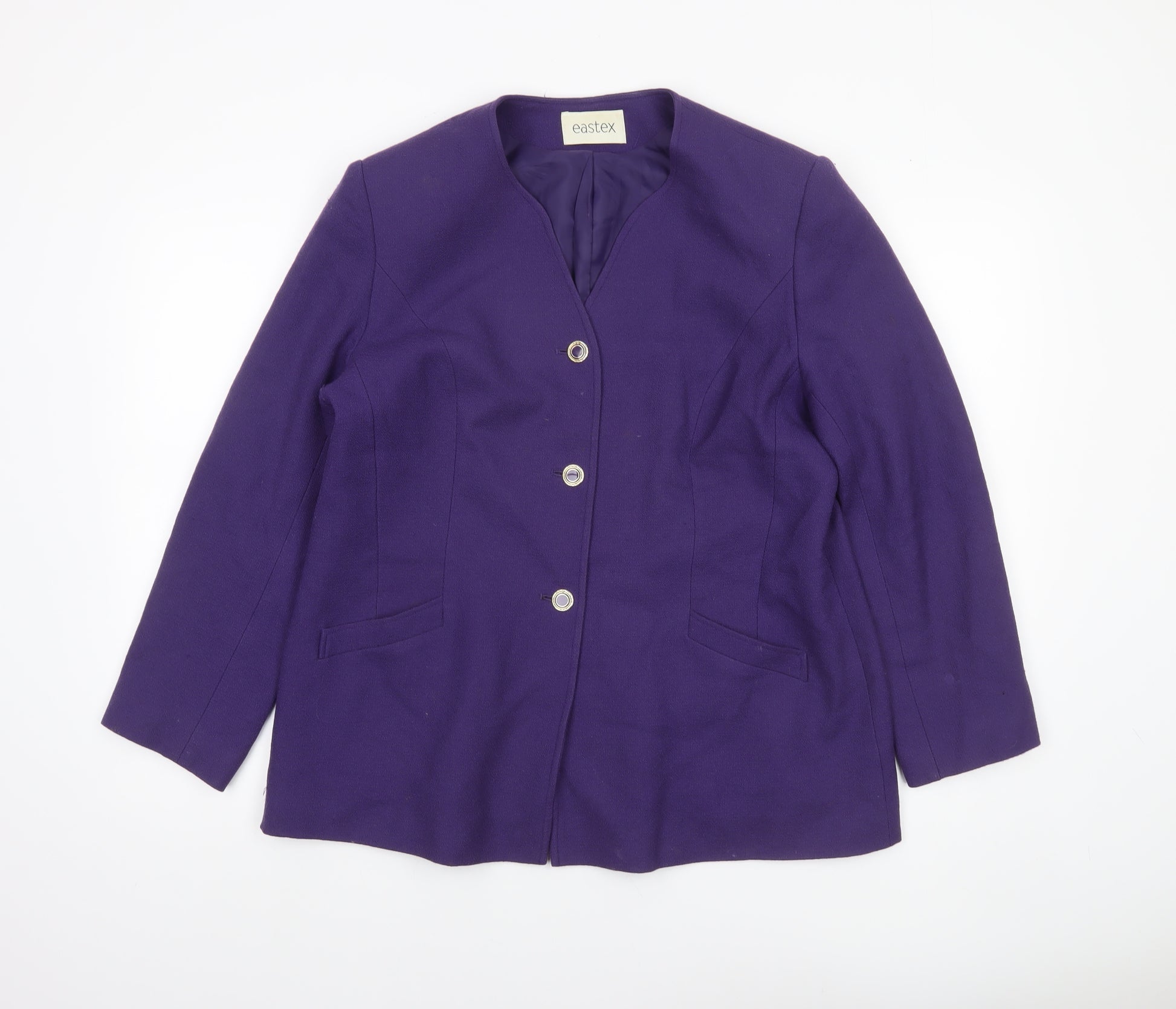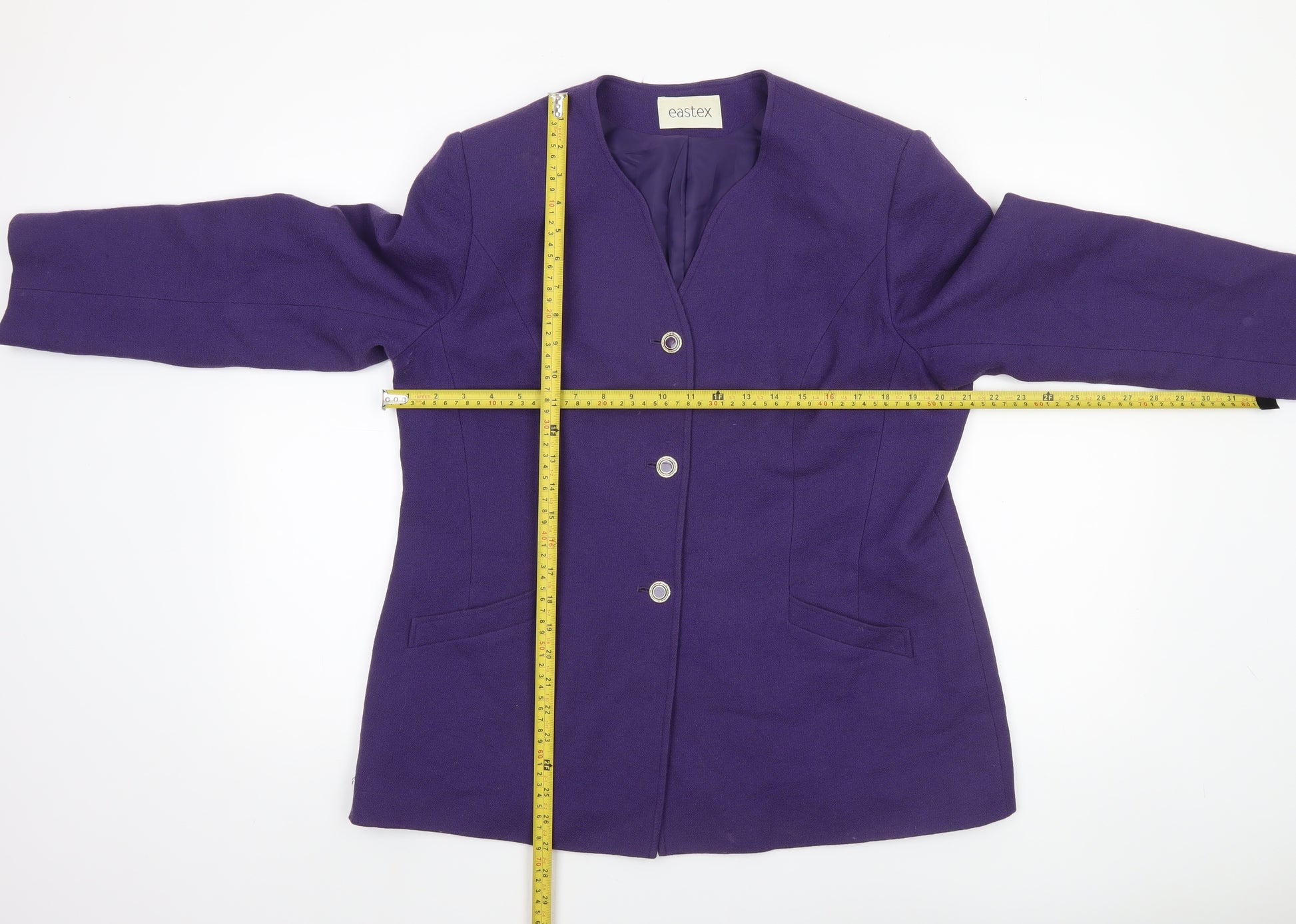 Elevate your wardrobe with this distinguished Eastex women's suit jacket, crafted in a deep purple hue that exudes sophistication and timeless appeal. Tailored in a structured silhouette, this classic blazer offers a flattering fit ideal for business and smart occasions alike. Made in Great Britain, the jacket reflects quality craftsmanship, featuring a high-quality 100% virgin wool exterior that provides luxurious texture, warmth, and durability. It is fully lined with 100% polyester for a smooth feel and enhanced comfort throughout the day. The piece showcases elegant silver-toned buttons along the front closure, enhancing its refined appeal. The jacket features two front pockets for functionality and design detail, adding to its versatile and polished style. Designed with long sleeves and a clean neckline, this single-breasted blazer falls at a regular length, delivering a professional look whether paired with suit trousers or a matching skirt. The high-quality materials ensure durability, while the wool blend offers natural temperature regulation, making it suitable for autumn and winter seasons. This Eastex jacket is ideal for formal, business, and workwear occasions, effortlessly combining elegance with practicality. It remains in excellent pre-owned condition with minimal signs of wear, reflecting careful previous ownership. Add this quality Eastex purple blazer to your wardrobe for a touch of classic British tailoring that never goes out of style.